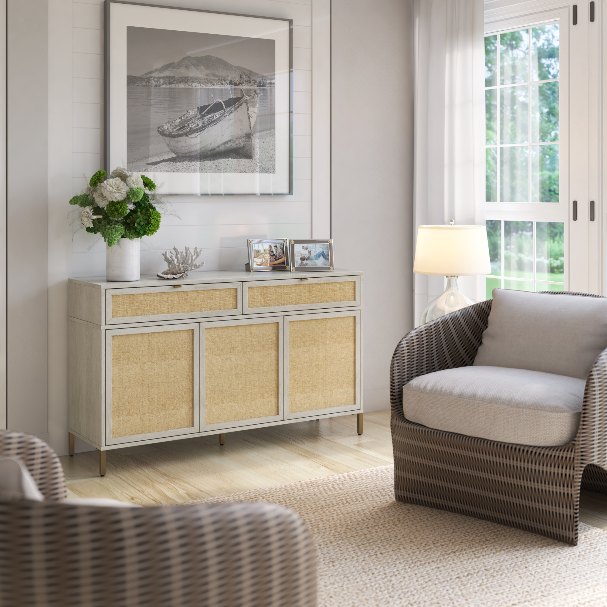 For a perfect, breezy look, we love this sideboard with a gray driftwood-inspired finish and linen panels, shown above. Versatile enough for your dining room or family room, this multifunctional piece is suitable for any room where you need extra storage.