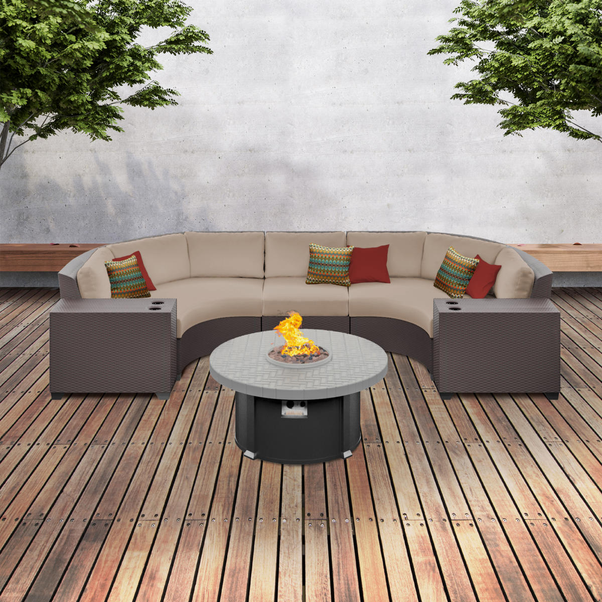 · Includes one 3-pc. curved sectional sofa, two cup tables, and one propane powered 48-inch fire pit (decorative throw pillows sold separately)
