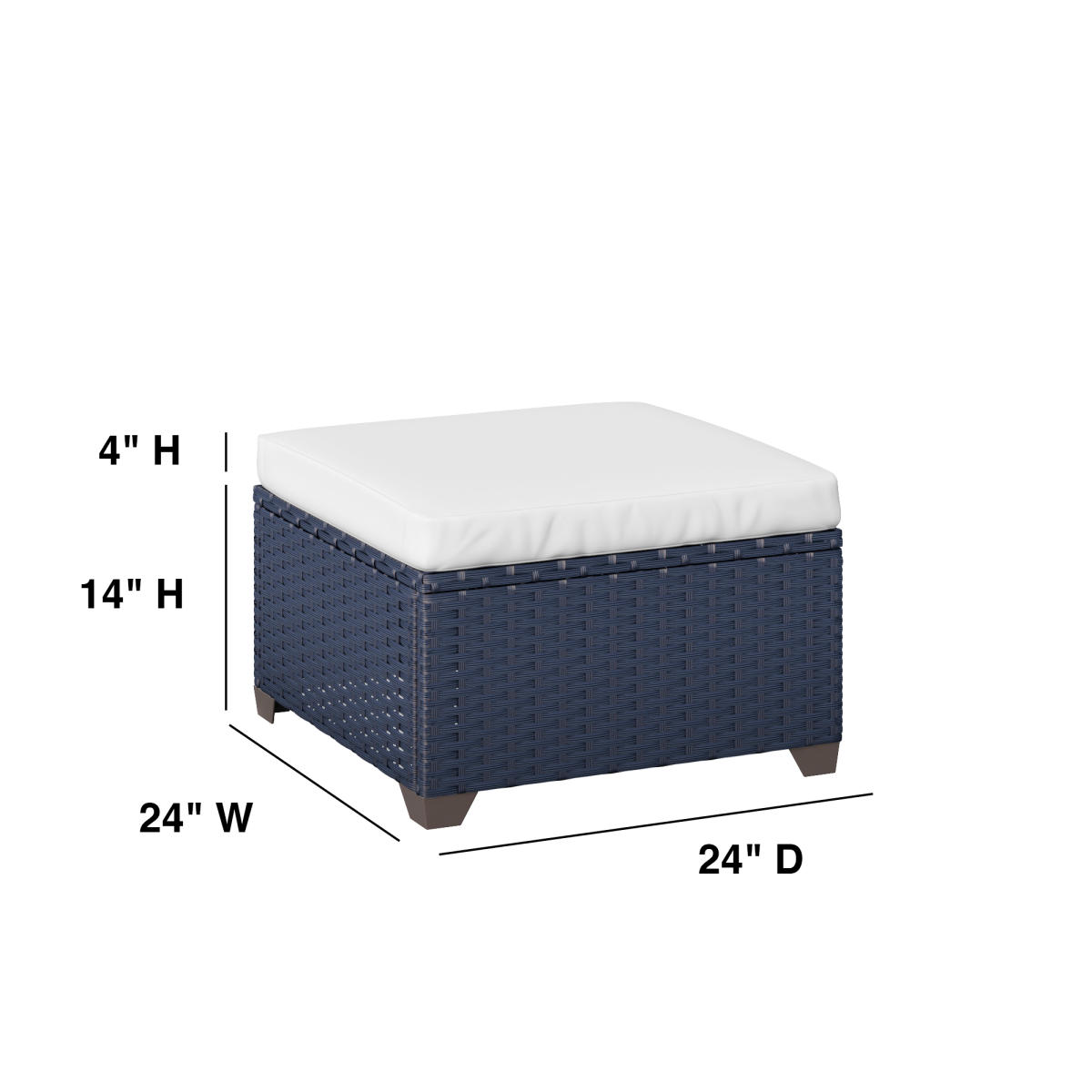 With a timeless, eye-catching elegance, brilliant white cushion covers, and a fits-anywhere navy wicker, the Delray Outdoor Navy Wicker Ottoman is built to impress! Powder-coated steel construction and stylish PE wicker mean that your set is protected from the elements, so you can enjoy your patio, outdoor sitting area, or deck for years to come.
