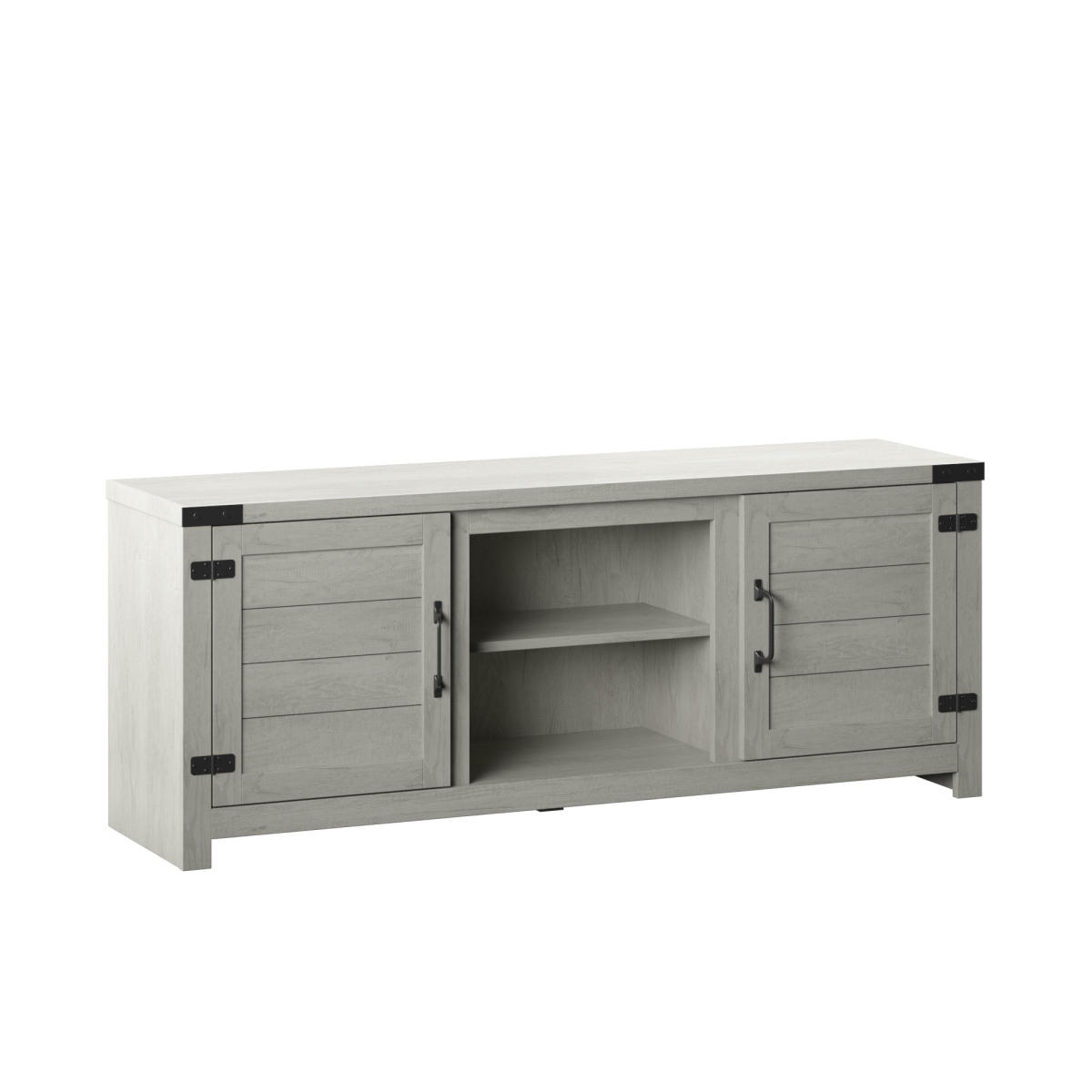 · TV stand corners and cabinet doors feature metallic hardware with nail head details