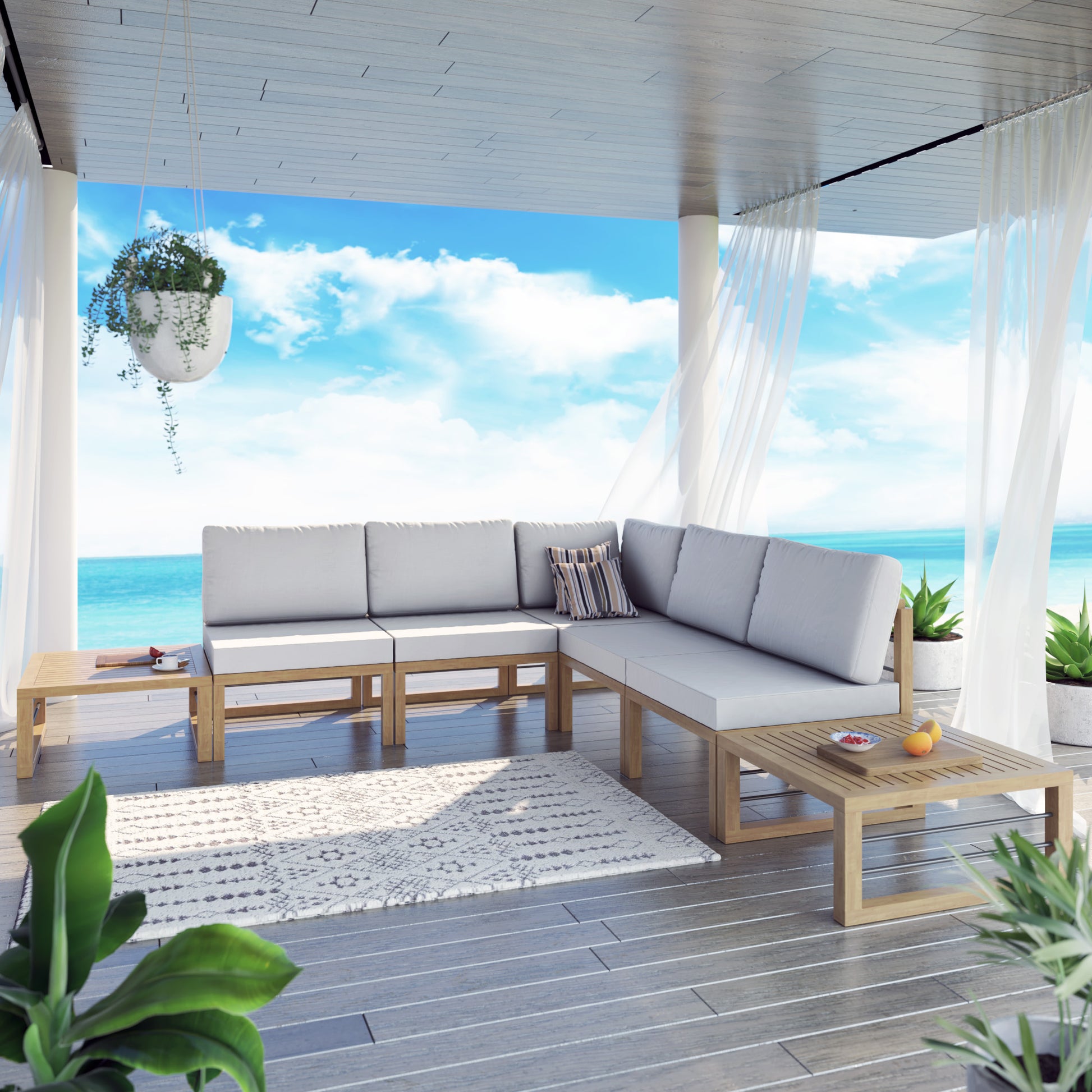 Whether you’re looking to relax or are entertaining on your deck or patio, you can do it in style with this 7 Piece Aluminum Outdoor Conversation Set. With modern lines and a fresh look, this modular set includes one corner sofa seat, four armless sofa seats, and two ottoman/coffee tables. You can configure the pieces of this set in a variety of ways to suit your space, and thanks to the weather-resistant aluminum that has a wood-grain coating, you get all the style and durability of wood furniture and none of the upkeep. With these cushions, you’ll also receive two cushion covers. One cover is our standard color and is already on the cushion, and the other cover will be the color of your choice, so you can refresh your outdoor oasis whenever you’d like. Zippered, removable cushion covers are machine-washable (air dry only). Plus, the 2-in-1 design of the ottomans allow them to function as coffee tables when you need additional space for drinks and snacks.