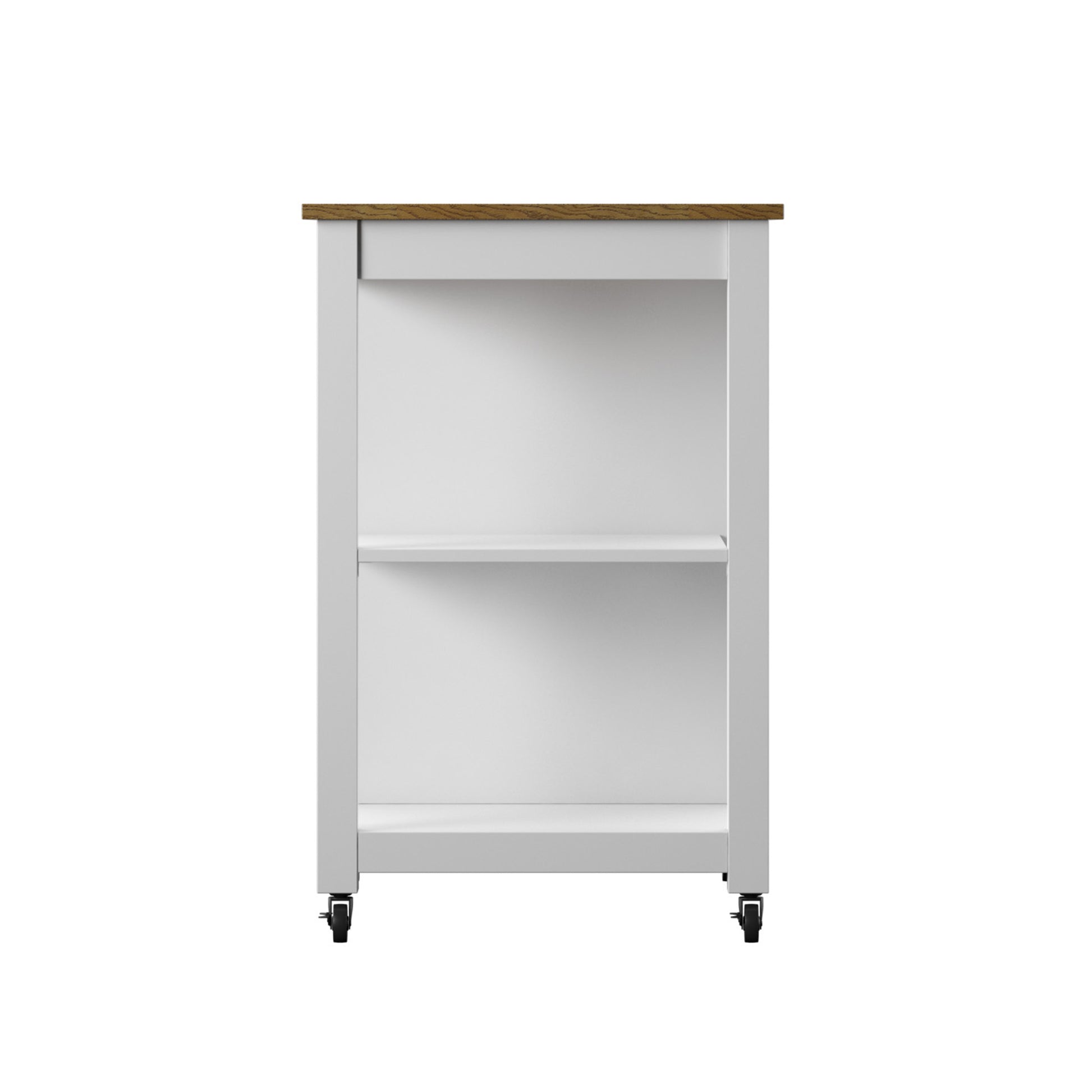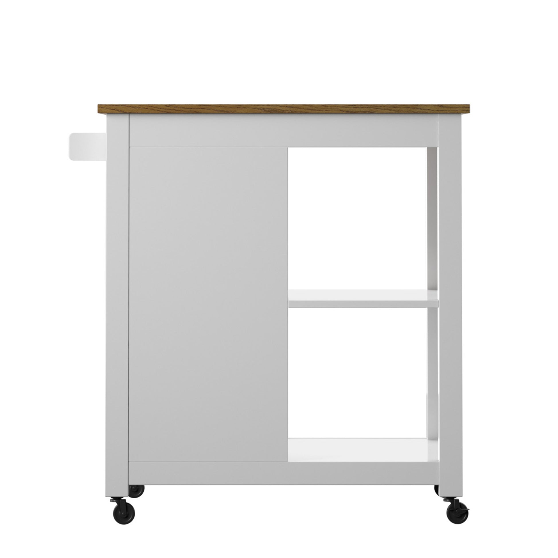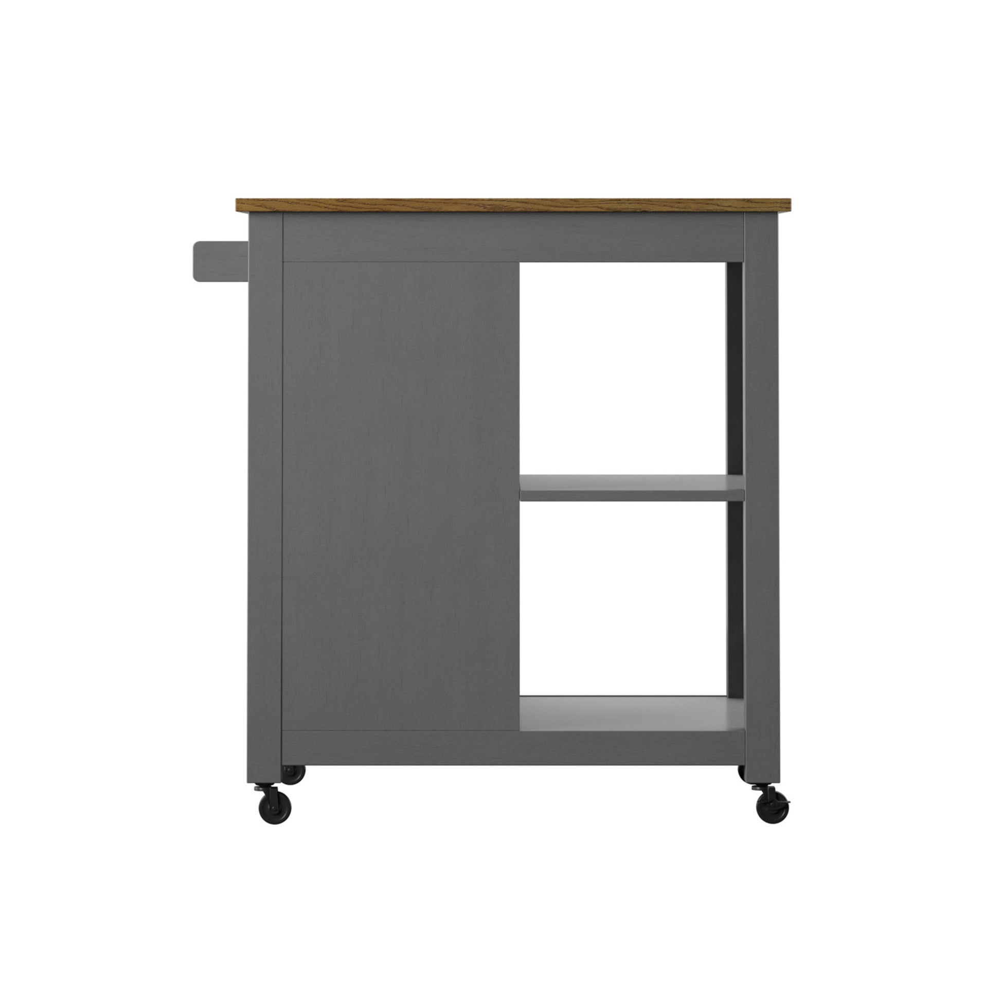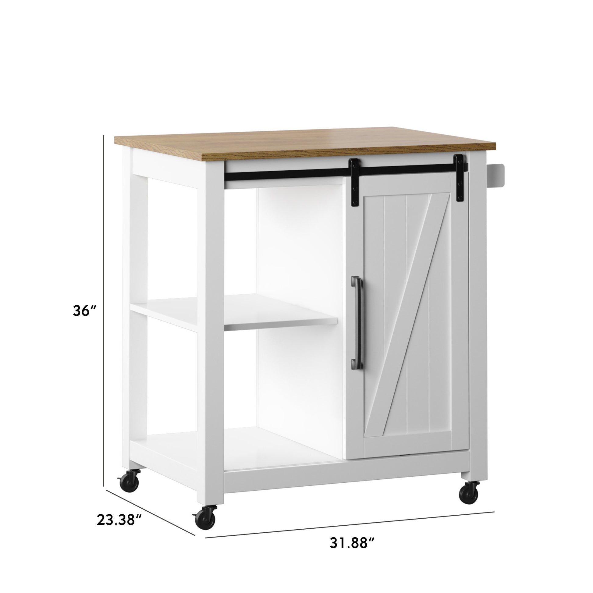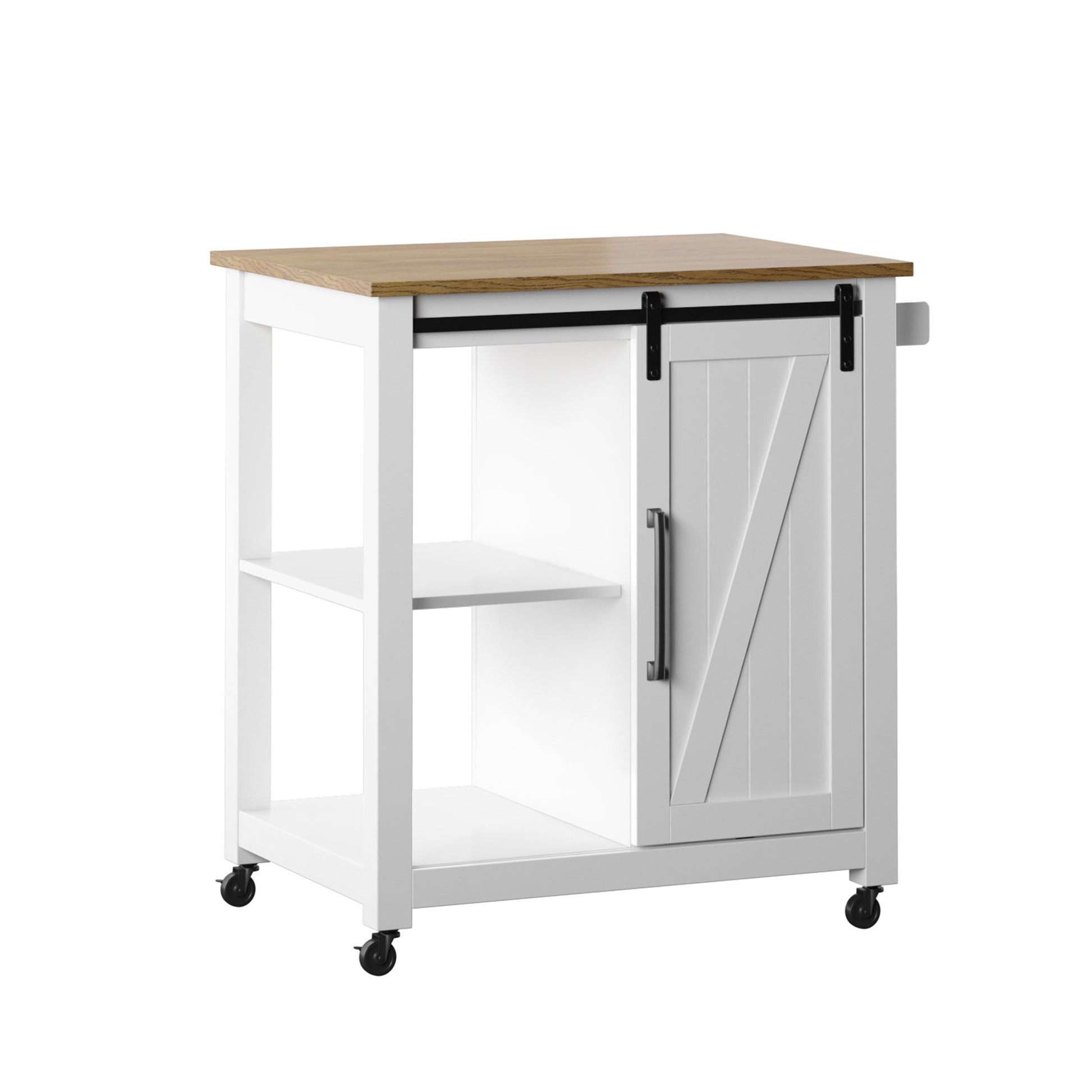 Everything you need for mealtime prep and serving can be found all in one place with modern farmhouse style in this rolling kitchen cart. An extra open workspace for your kitchen offers you plenty of room to lay out ingredients. Chop and mix worry-free with the attached towel rack for any spills that may happen and locking swivel casters on the four-wheeled base that keep the cart from slipping away. For extra storage, a barn-style cabinet door slides along track hardware to reveal an adjustable interior shelf. Use the two levels of exterior shelving for larger items like a multi-cooker that take up too much space on your counters.