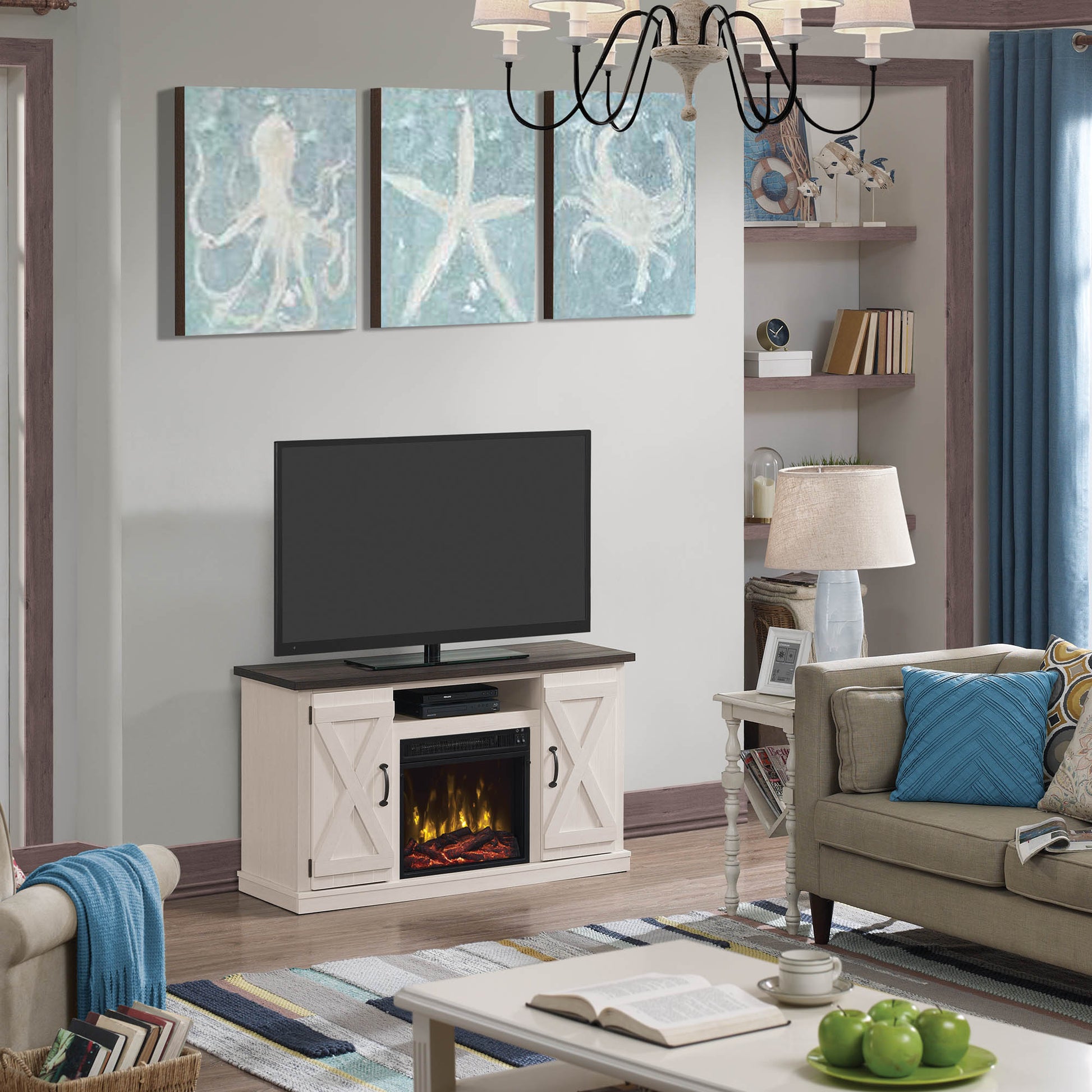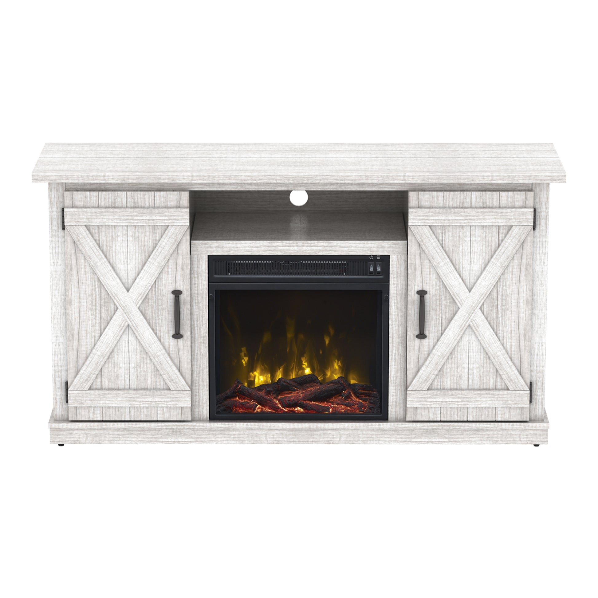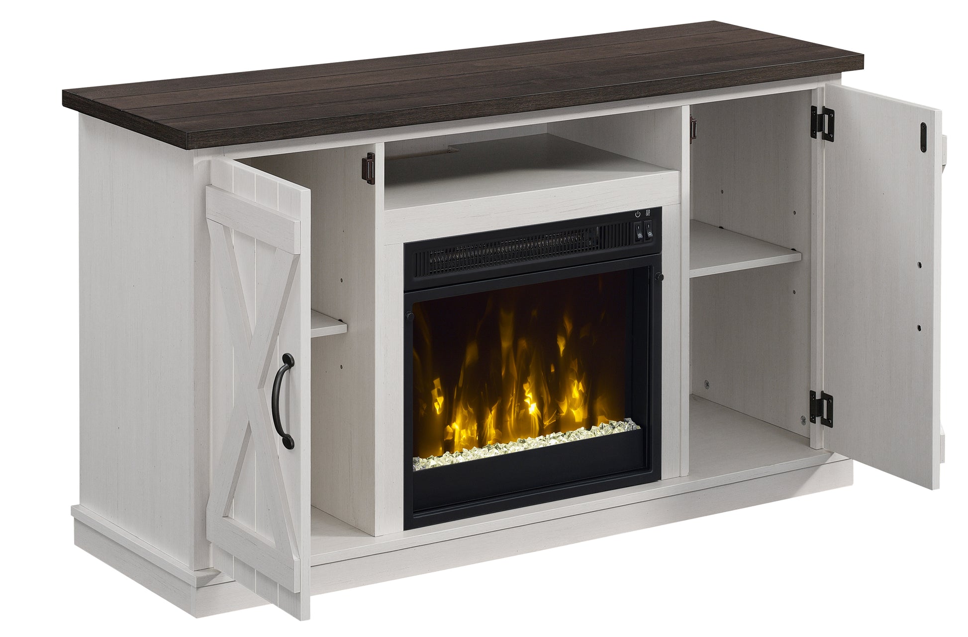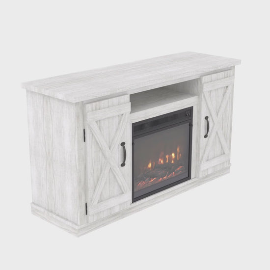 Enjoy modern farmhouse charm with this TV stand with electric fireplace made for flat screen TVs up to 55 inches and 40 pounds. An open media shelf holds your cable box, gaming console, or other AV components while side cabinets with adjustable shelves provide storage your movie collection and electronic accessories. The cabinets and TV stand top feature a plank design with decorative saw cut X mullions on the doors for added rustic flair. For even more ambiance, use the electric fireplace to create a cozy atmosphere while warming up to 400 square feet of your home. The flame effects can be used with or without heat for the look of a gentle rolling fire all year long, even during warmer months. Choose between included contemporary fire crystals or a realistic log set with ember bed to showcase the beautiful flames.