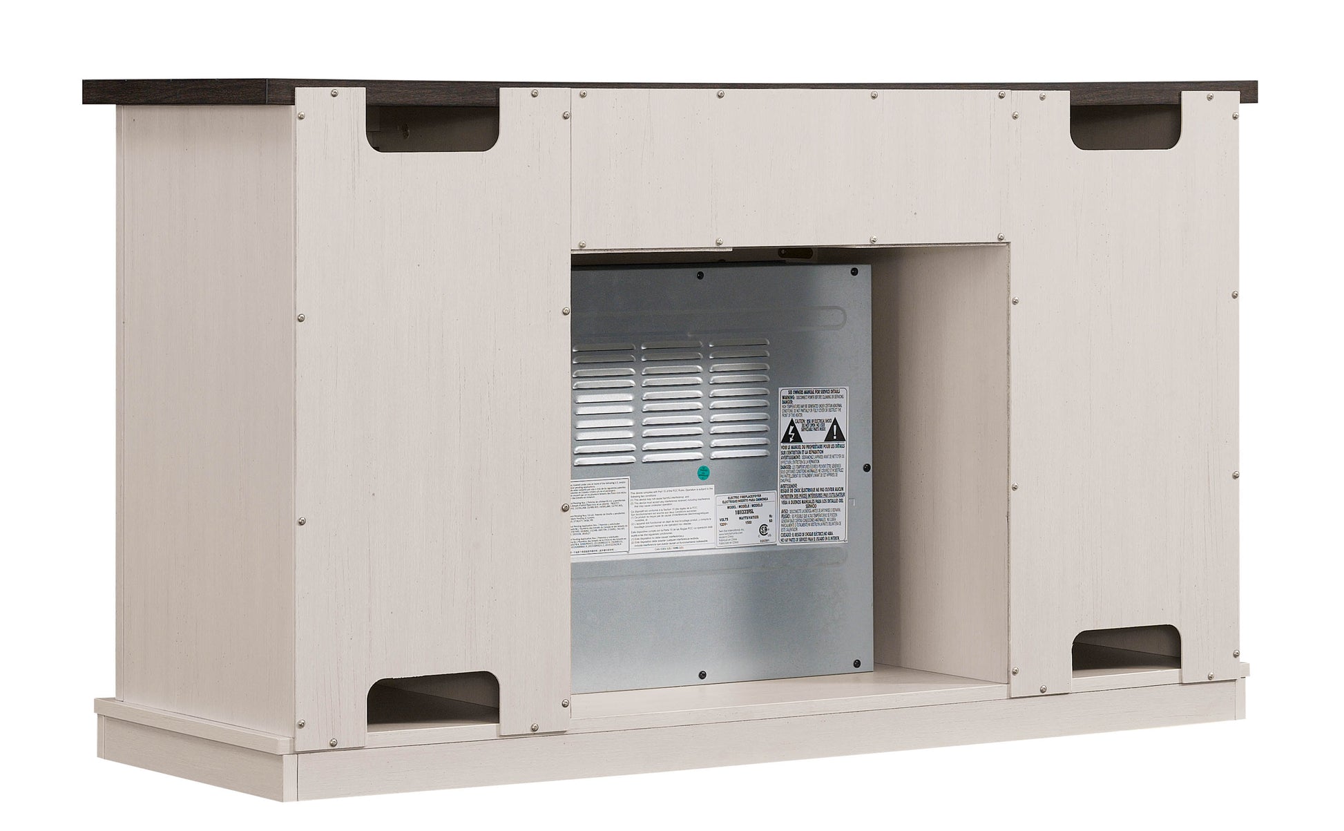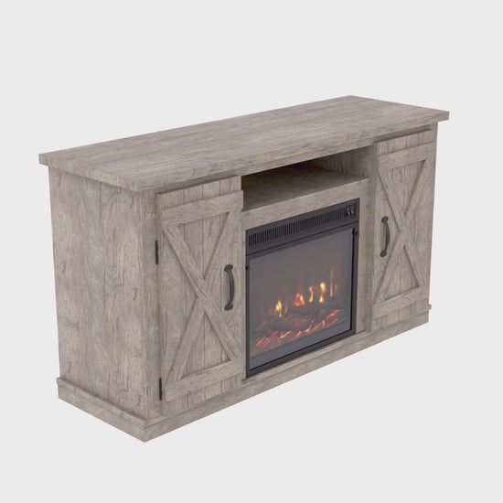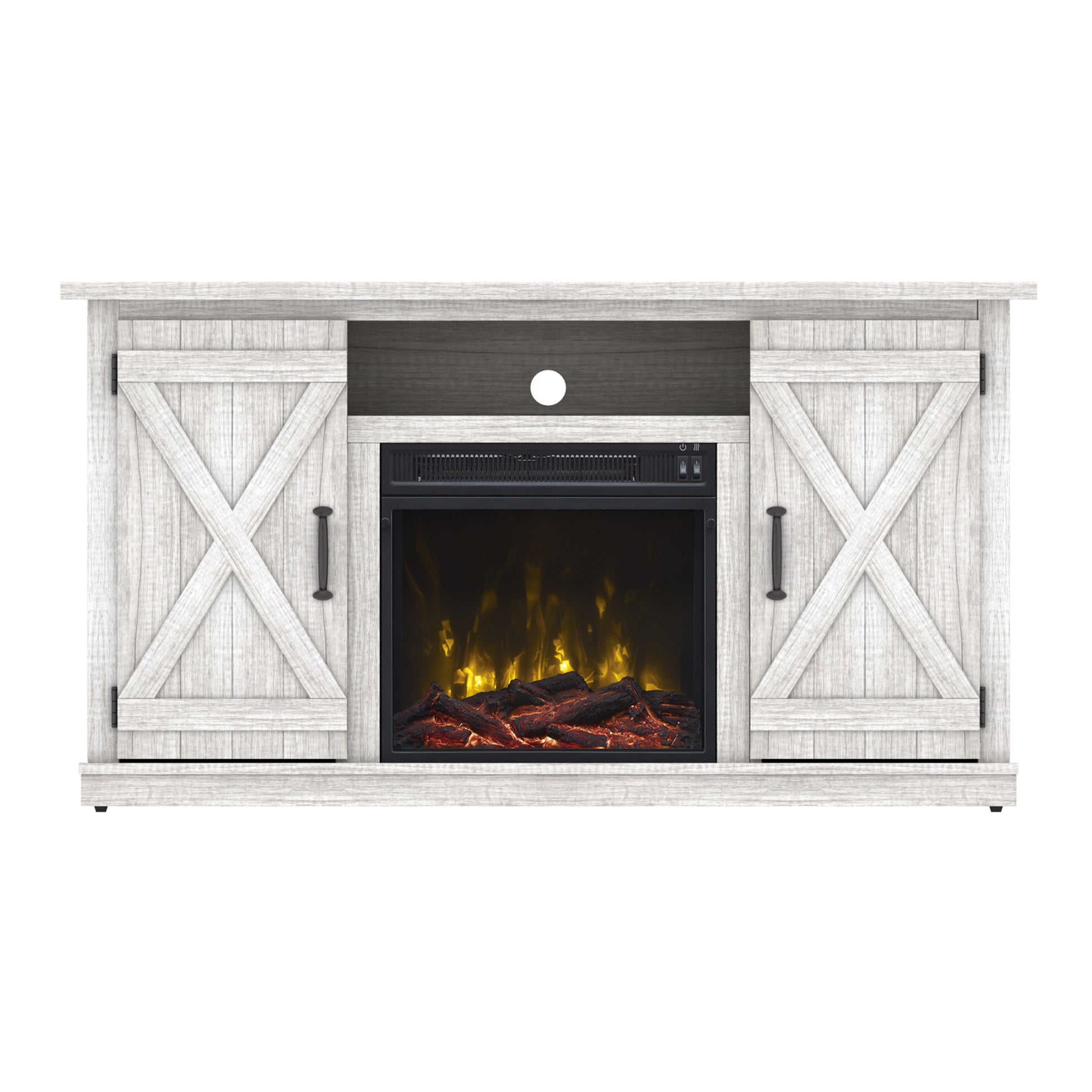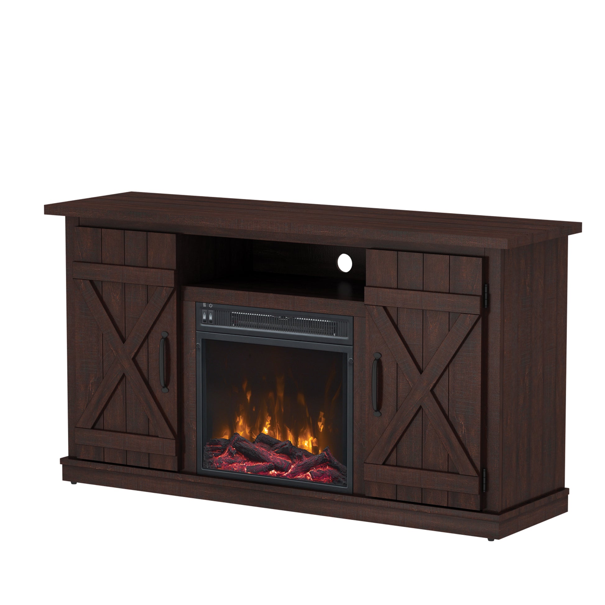 Enjoy modern farmhouse charm with this TV stand with electric fireplace made for flat screen TVs up to 55 inches and 40 pounds. An open media shelf holds your cable box, gaming console, or other AV components while side cabinets with adjustable shelves provide storage your movie collection and electronic accessories. The cabinets and TV stand top feature a plank design with decorative saw cut X mullions on the doors for added rustic flair. For even more ambiance, use the electric fireplace to create a cozy atmosphere while warming up to 400 square feet of your home. The flame effects can be used with or without heat for the look of a gentle rolling fire all year long, even during warmer months. Choose between included contemporary fire crystals or a realistic log set with ember bed to showcase the beautiful flames.