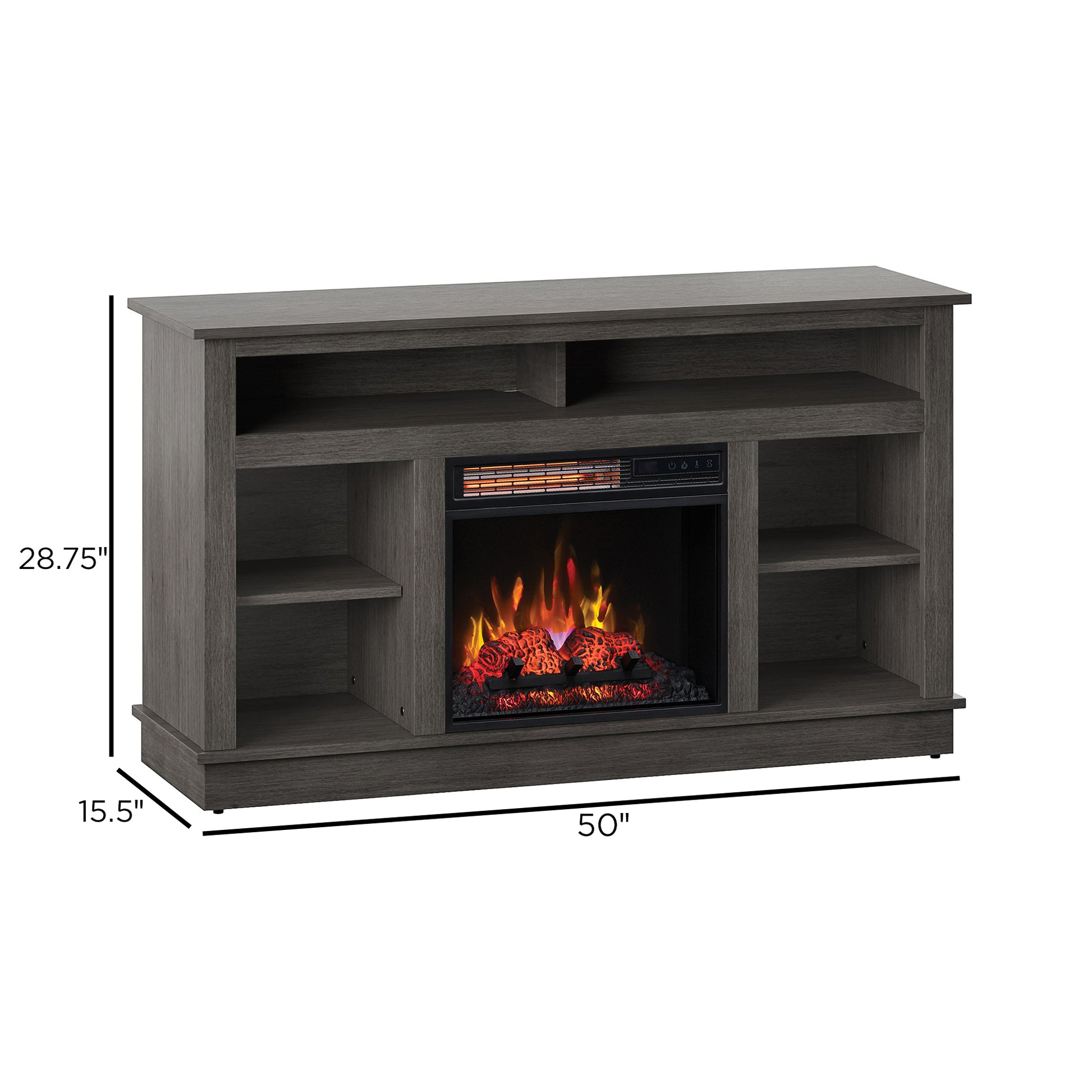 Add this transitional Douglas TV stand with an electric fireplace to your living space. The electric fireplace provides supplemental zone heating for up to 1000 sq. ft. The TV stand features a full length, partitioned center shelf for housing AV components as well as open side cabinets for entertainment accessories or decorative items for display. The electric fireplace features patented Safer Plug® fire prevention technology that provides added safety by monitoring the temperature of the plug to prevent electrical fire, circuit or product damage. The Spectrafire® flame effect technology offers three blue and three amber flame effect options to create the perfect ambiance for any style. Operate the flame effects with or without heat for a rolling fire all year long.
