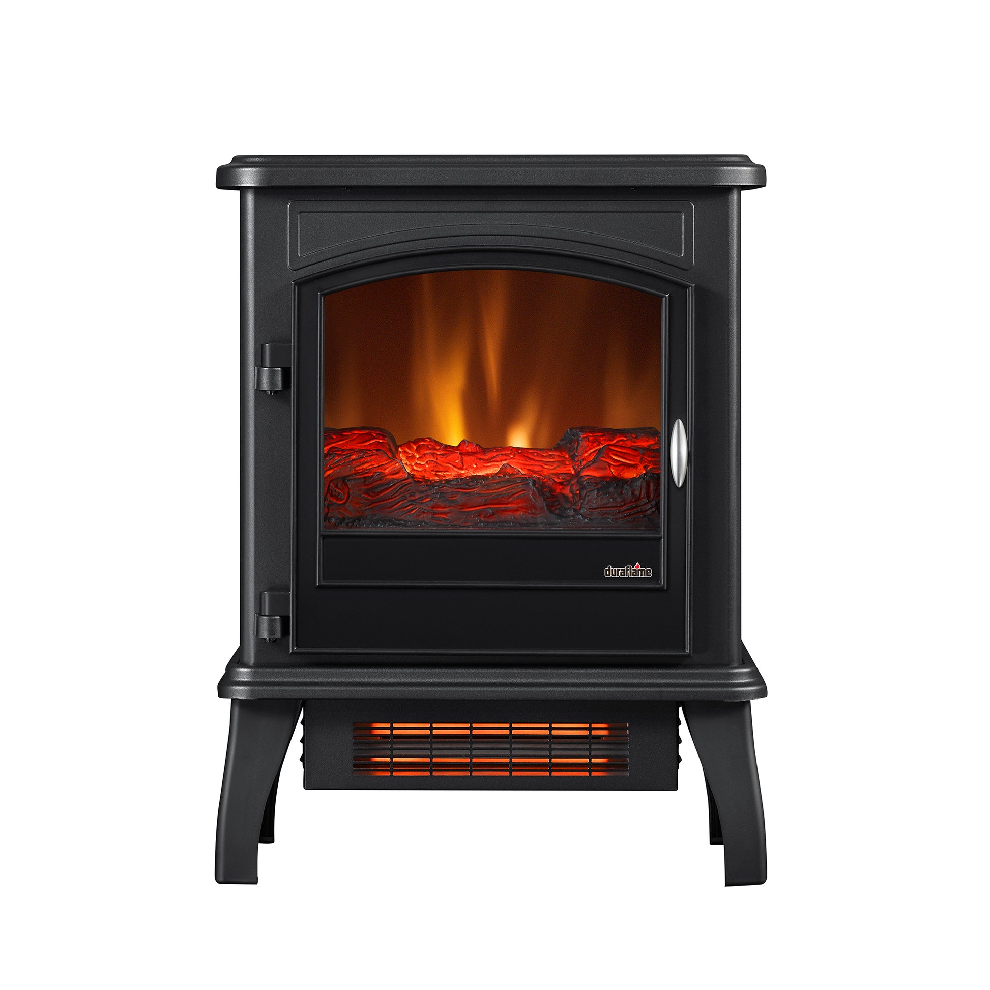 Warm up any space large or small on a cold night to create a more comfortable environment with the Duraflame Infrared Quartz Electric Fireplace Stove Heater. This heater adds a vintage touch to any room with a black metal body, operable door with mullions, and arched frame detailing. The 5,200 BTU heater provides supplemental zone heating for rooms up to 1,000 square feet to help you save money by turning down your thermostat and adding heat only when and where you need it. Infrared heat helps maintain the natural humidity within the air, for comfortable heat that doesn't dry out the room's air. The realistic flame effect with a glowing log and ember bed can be operated with or without heat, providing the ambiance of a gentle rolling fire all year long. An adjustable thermostat allows you to regulate the temperature of the room. Manufactured and distributed by Twin-Star International, Inc., under license from Duraflame, Inc. duraflameĀ®, the flame symbol and logo are registered trademarks of Duraflame, Inc.
