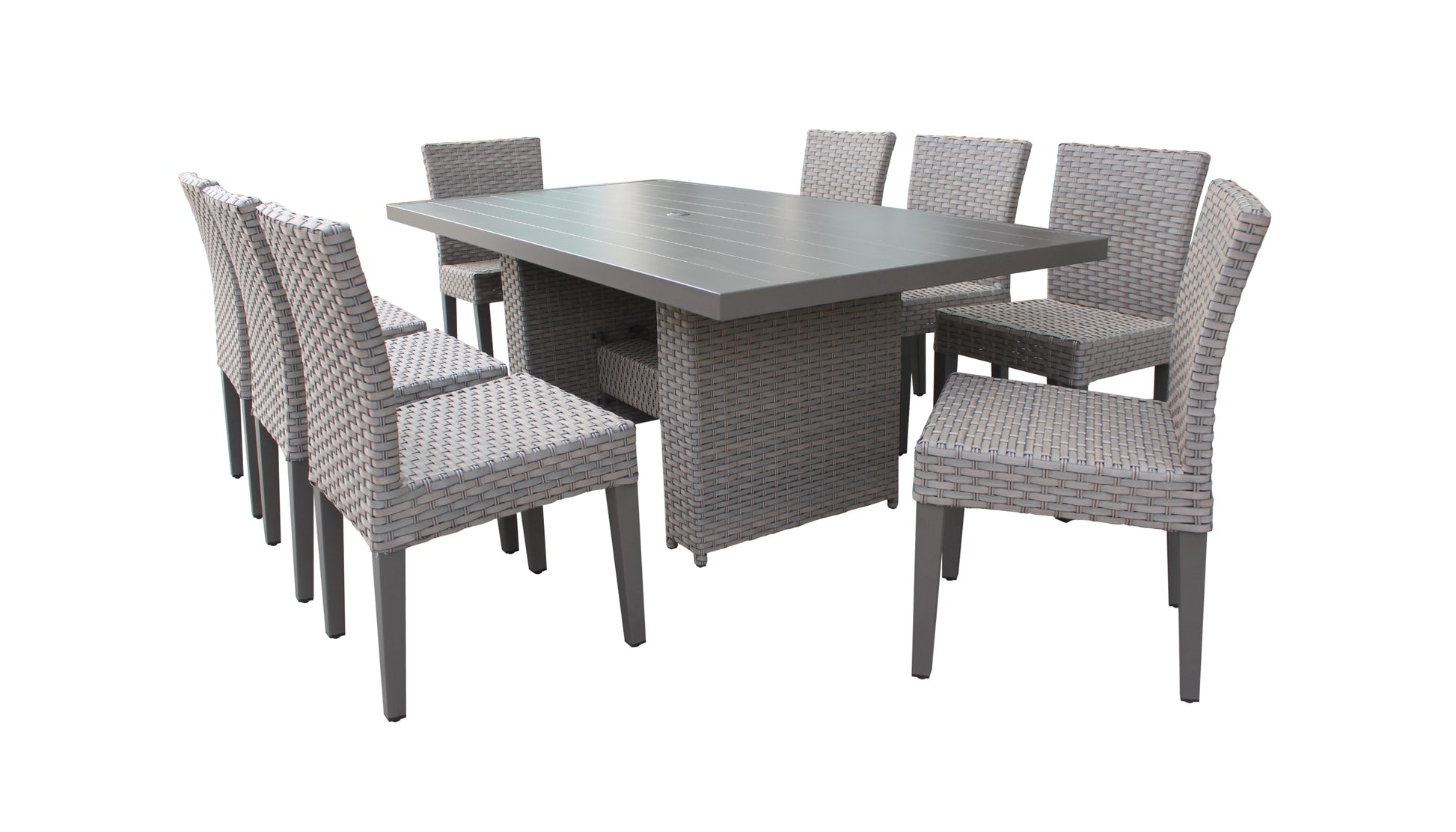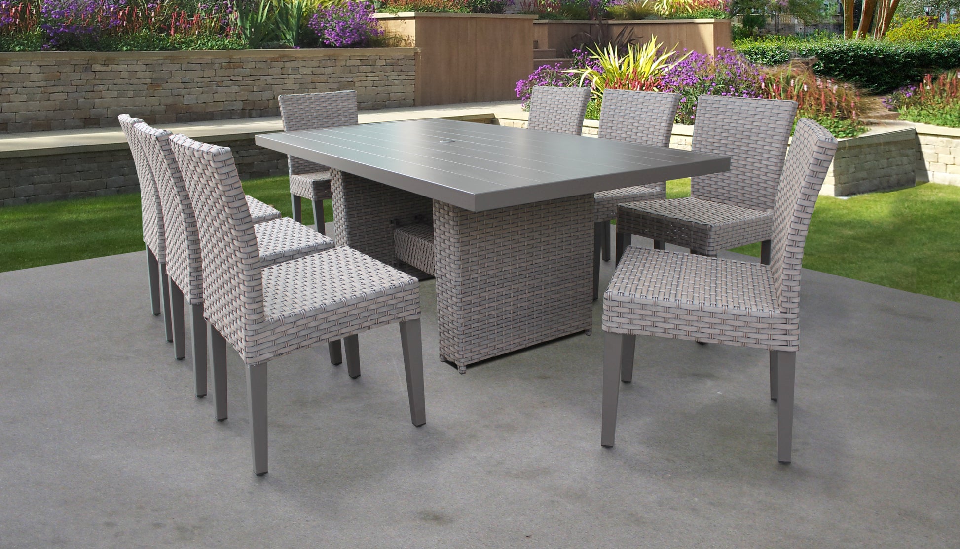Add sophistication and elegance to your outdoor dining with this 9-Piece Dining Set. With a large rectangular table and supportive chairs, everyone gets the best seat. Serve your guests in style with flattering colors and a weather-resistant wicker weave, perfect for handling spills and rainy nights alike. Lightweight, powder-coated aluminum frames offer long-lasting support and make for easy arranging; plus, this set matches perfectly with other pieces from the same collection. Outdoor entertaining never looked so good or lasted so well.