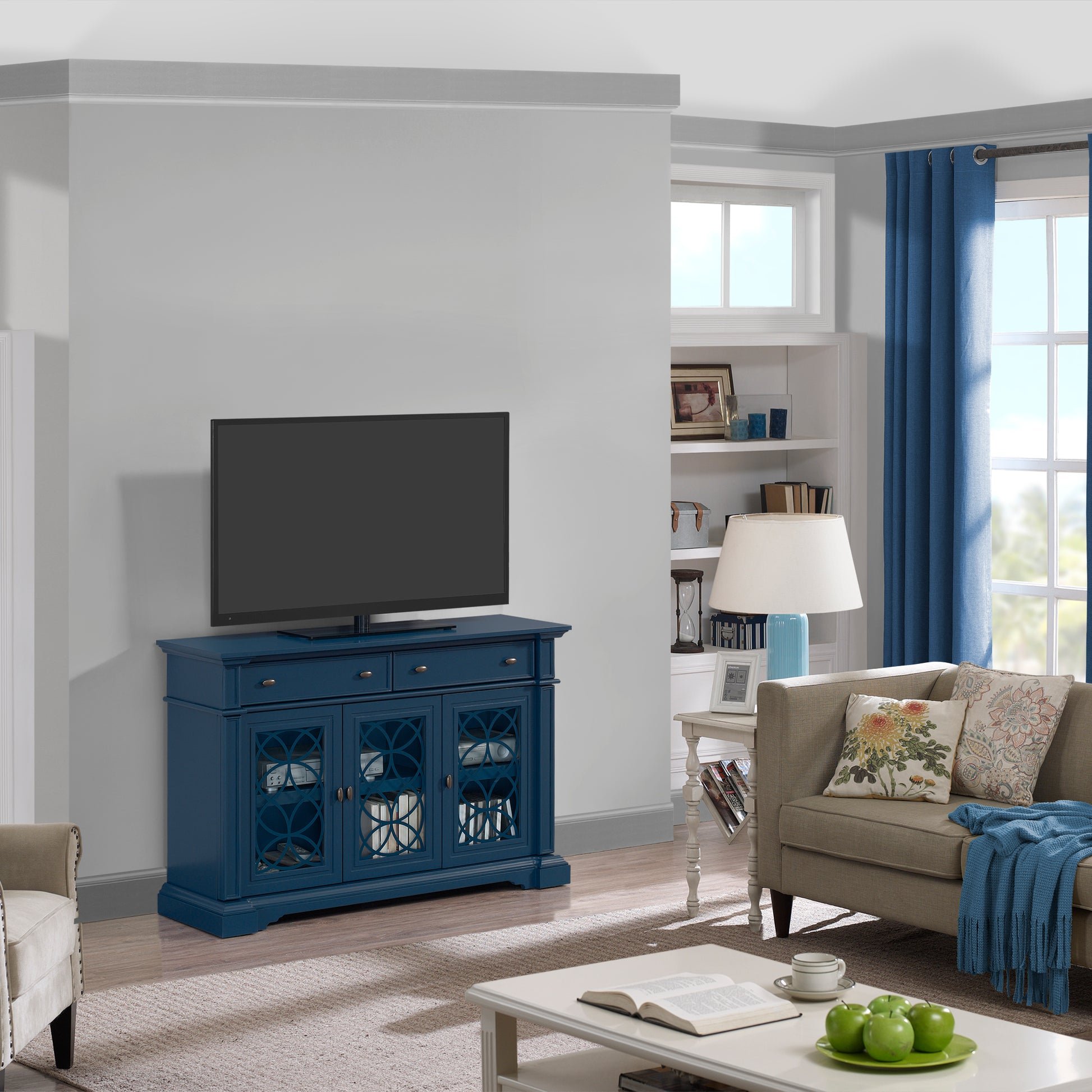 This TV stand brings distinctive design to any living room with unique glass cabinet doors and decorative mullions. It’s also more than functional with plenty of storage and the ability to accommodate most flat screen TVs up to 55 inches and 55 pounds. Stylish storage includes two upper storage drawers and two cabinets behind the three glass-front doors adorned with screen-printed frets inside the glass. The larger cabinet on the left side of the stand features double doors and one adjustable interior shelf. The right side cabinet sits behind one glass-front door and also includes one adjustable shelf for storage and display. Openings in the back of the stand help control cord tangles.