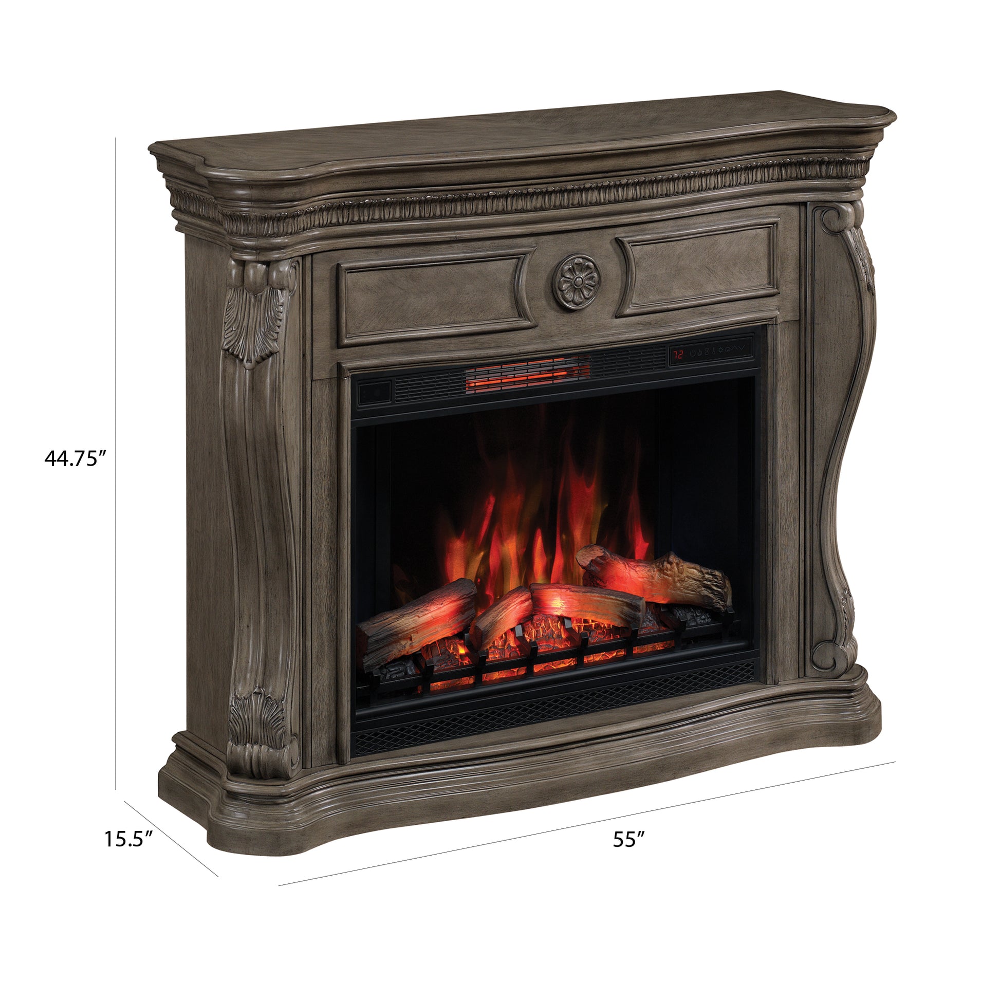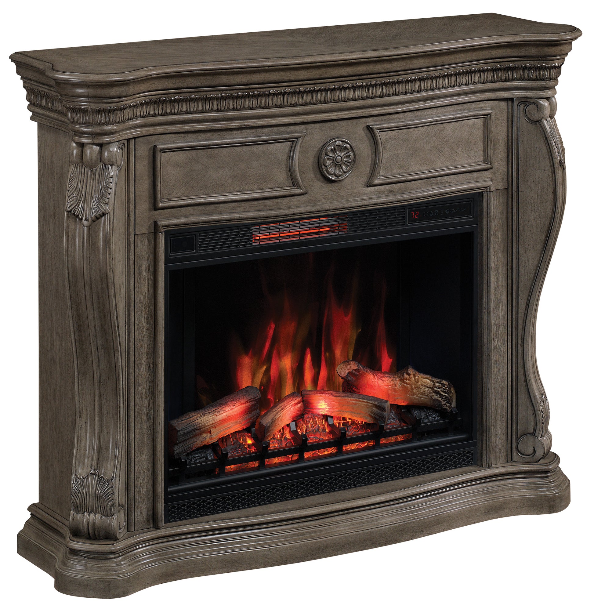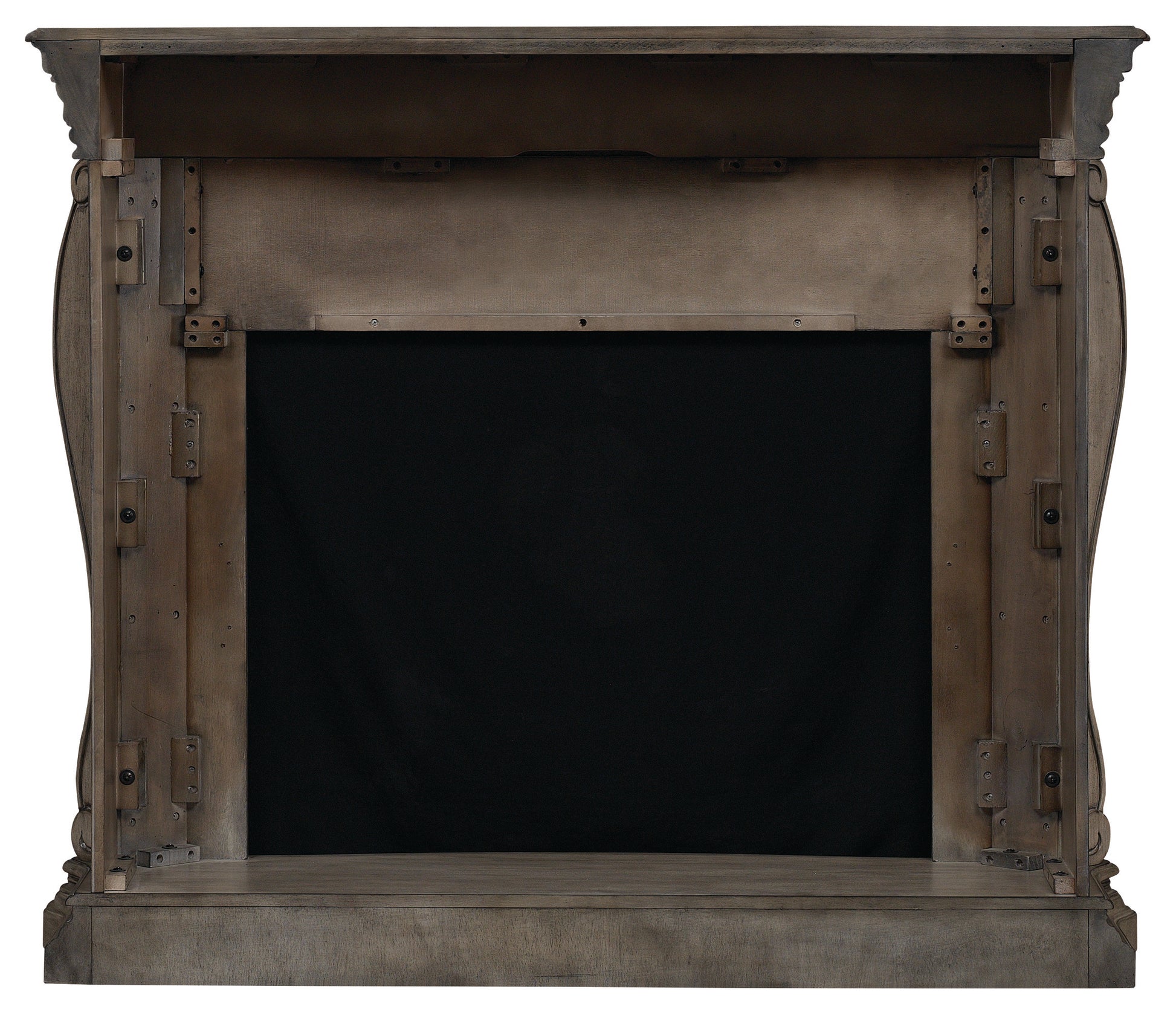 The Lexington wall mantel makes a beautiful addition to any living space in the home. The mantel features a Lexington Gray finish with a stunning rosette medallion on the center panel, framed by bookmatched veneers. The corner posts are fashioned from solid wood in a swan’s neck style, while elegant serpentine detailing frames the base.