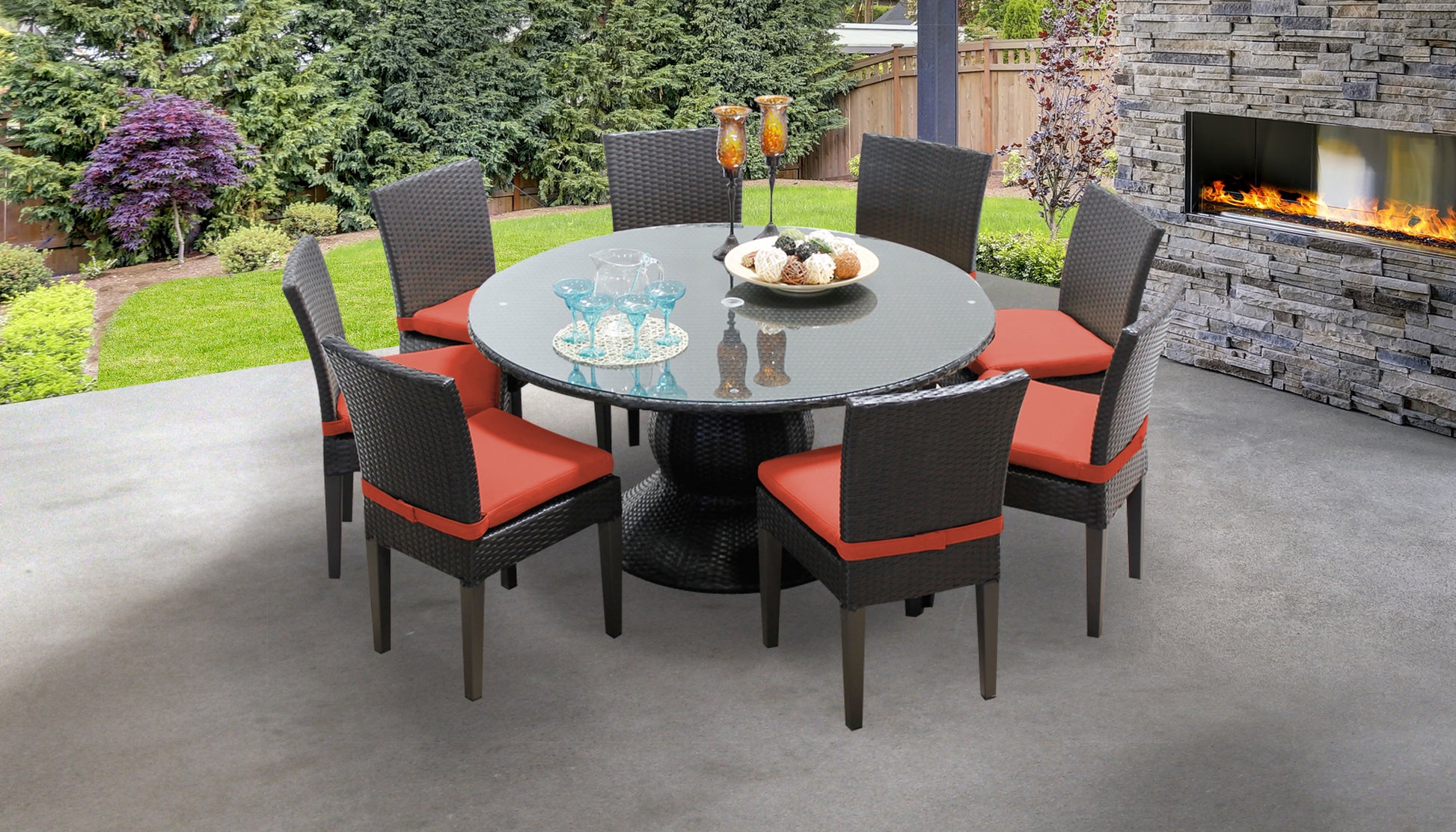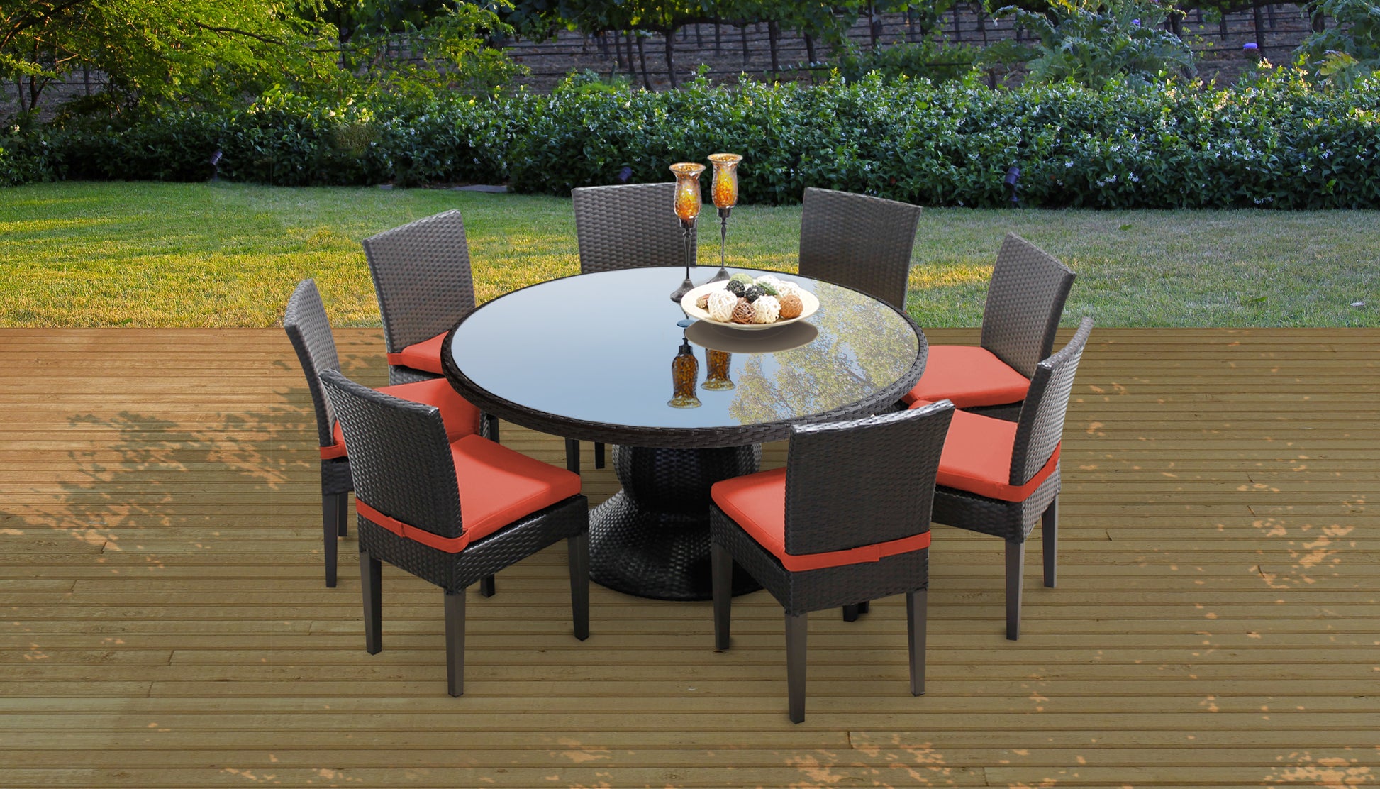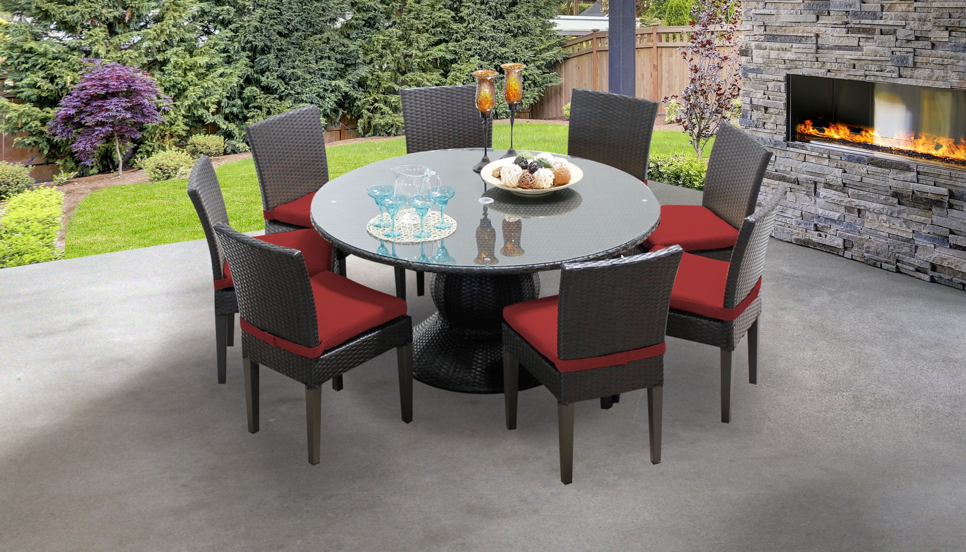 Create a stunning spot to gather with the Napa 9 Piece Round Outdoor Patio Wicker Dining Set with Cushions. The graceful round pedestal table with eight chairs in rich tones of espresso will turn heads. Your guests will love your new al fresco spot, and you’ll love the ease of outdoor clean-up. The tempered-glass top makes cleaning the tabletop quick while keeping the wicker weave in view. The umbrella hole in the center of the tabletop makes adding shade simple. The durable, powder coated aluminum frame is rust-resistant, so you can use this table in any climate without leaving rust stains behind. Seats up to eight people.