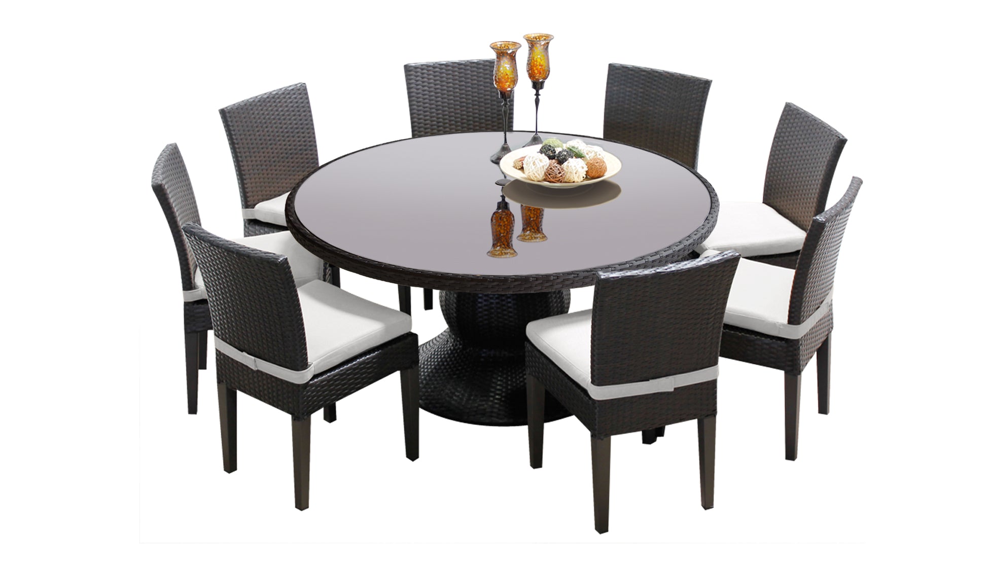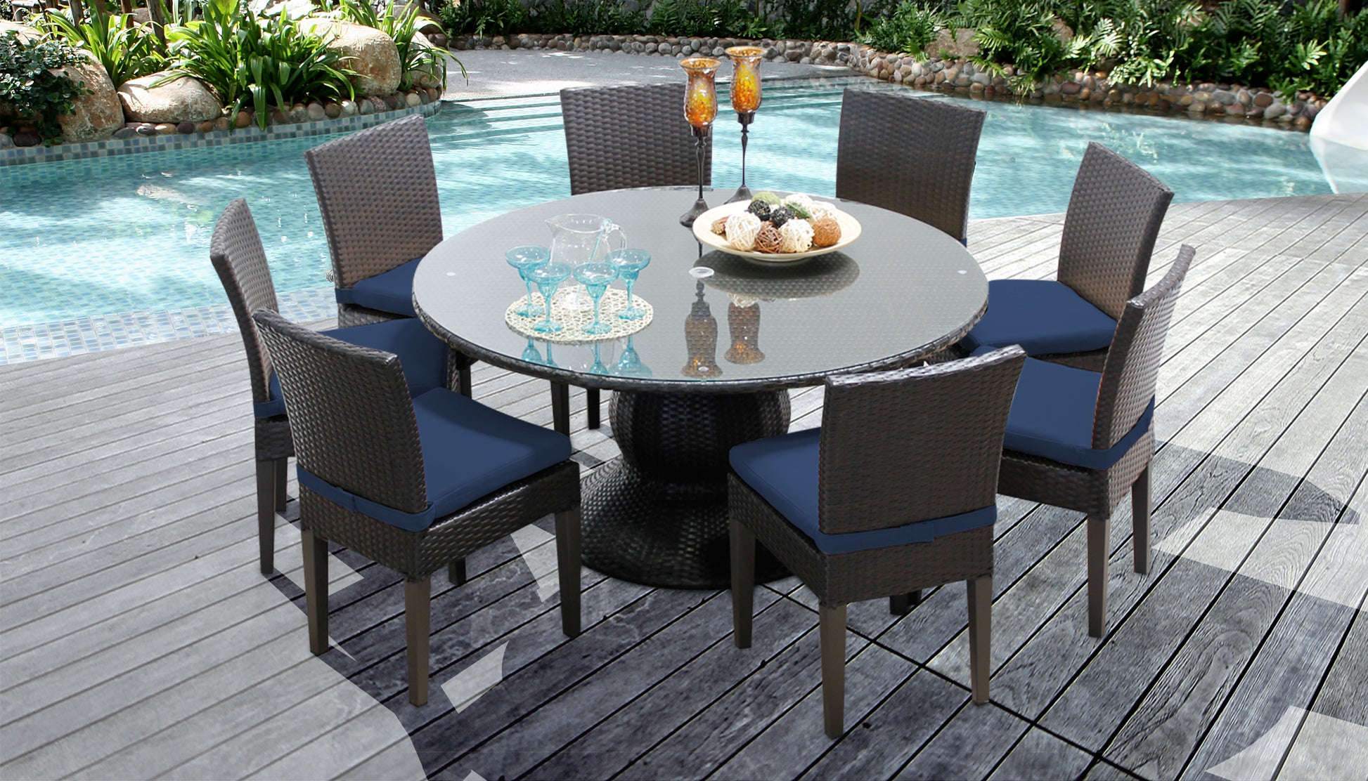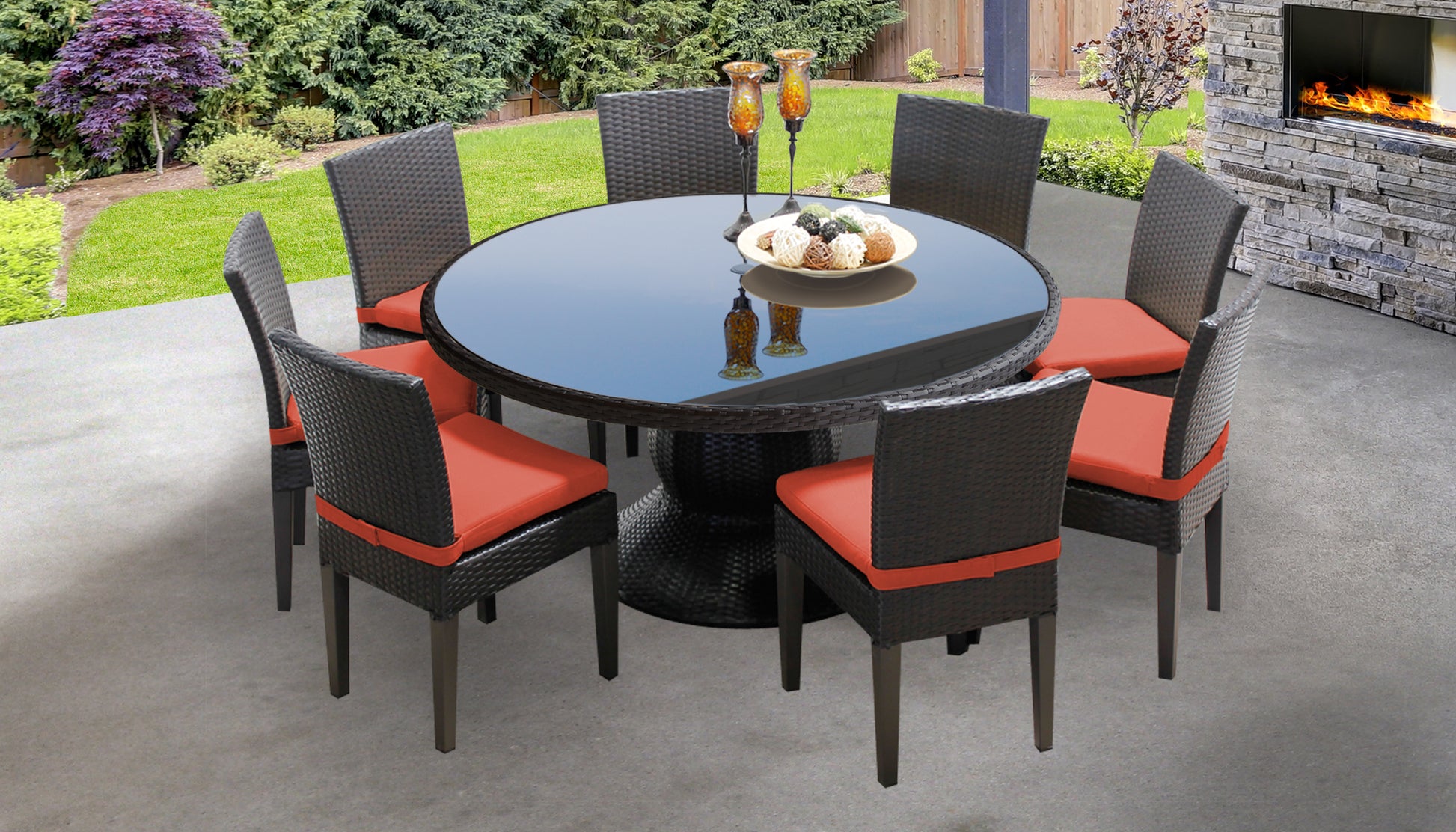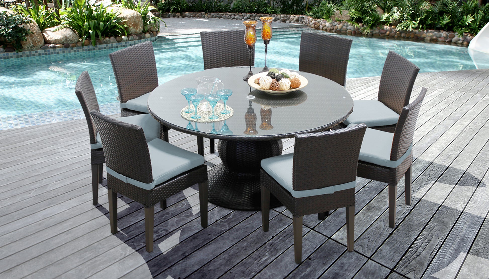 Create a stunning spot to gather with the Napa 9 Piece Round Outdoor Patio Wicker Dining Set with Cushions. The graceful round pedestal table with eight chairs in rich tones of espresso will turn heads. Your guests will love your new al fresco spot, and you’ll love the ease of outdoor clean-up. The tempered-glass top makes cleaning the tabletop quick while keeping the wicker weave in view. The umbrella hole in the center of the tabletop makes adding shade simple. The durable, powder coated aluminum frame is rust-resistant, so you can use this table in any climate without leaving rust stains behind. Seats up to eight people.