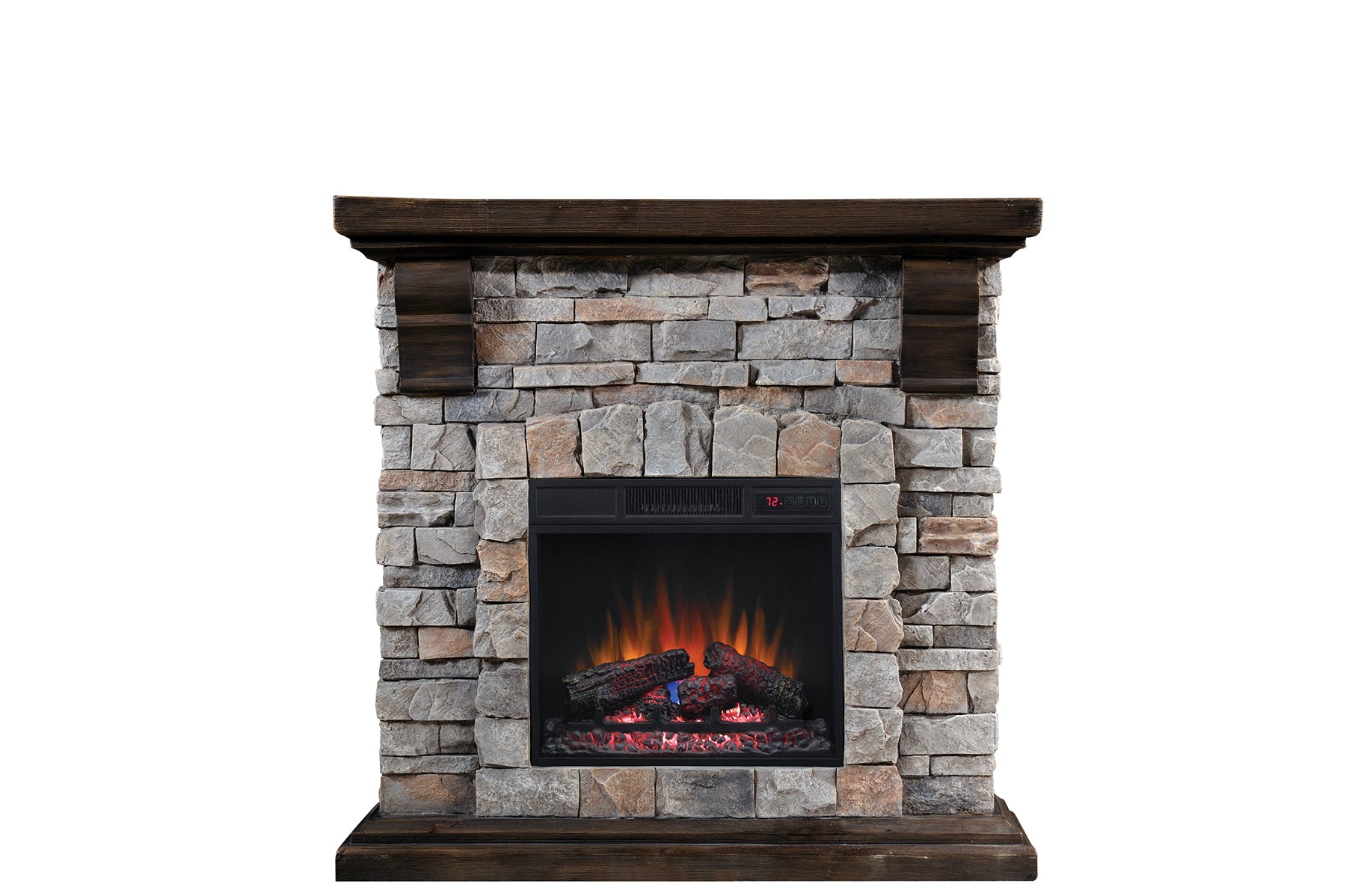 Add rustic style to any room in your home with this charming Pioneer electric fireplace mantel. The stone detailing has been carefully engineered to look and feel like real stone. The Brushed Dark Pine wood base and top with corbels complement the mantel, creating a charming focal point in any room of the home. The 18" infrared quartz electric fireplace provides supplemental heating for up to 1,000 square feet. The infrared heat helps to maintain the natural humidity within the air, resulting in moist, comfortable heat without drying out the room's air. Patent pending Safer Plug™ fire prevention technology provides added safety by monitoring the temperature of the plug to prevent electrical fire, circuit or product damage. Spectrafire® customizable flame effect offers three blue and three amber brightness options to give you the choice of a gas or traditional fire appearance to suit your style. Operate the flame effect with or without heat to enjoy a rolling fire all your long.