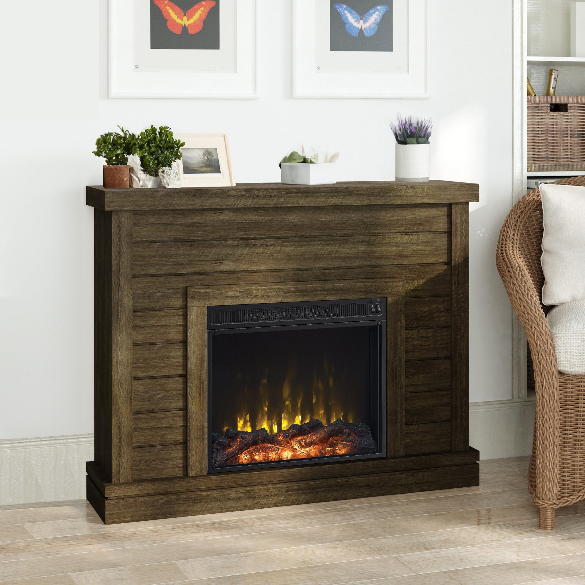 With efficient heat and beautiful, life-like flames, this wall mantel electric fireplace is sure to be your new favorite spot to gather round with friends and family. Shiplap details help to create a rustic cottage feel alongside brilliant fire that can be enjoyed with or without heat for a cozy home all year long.