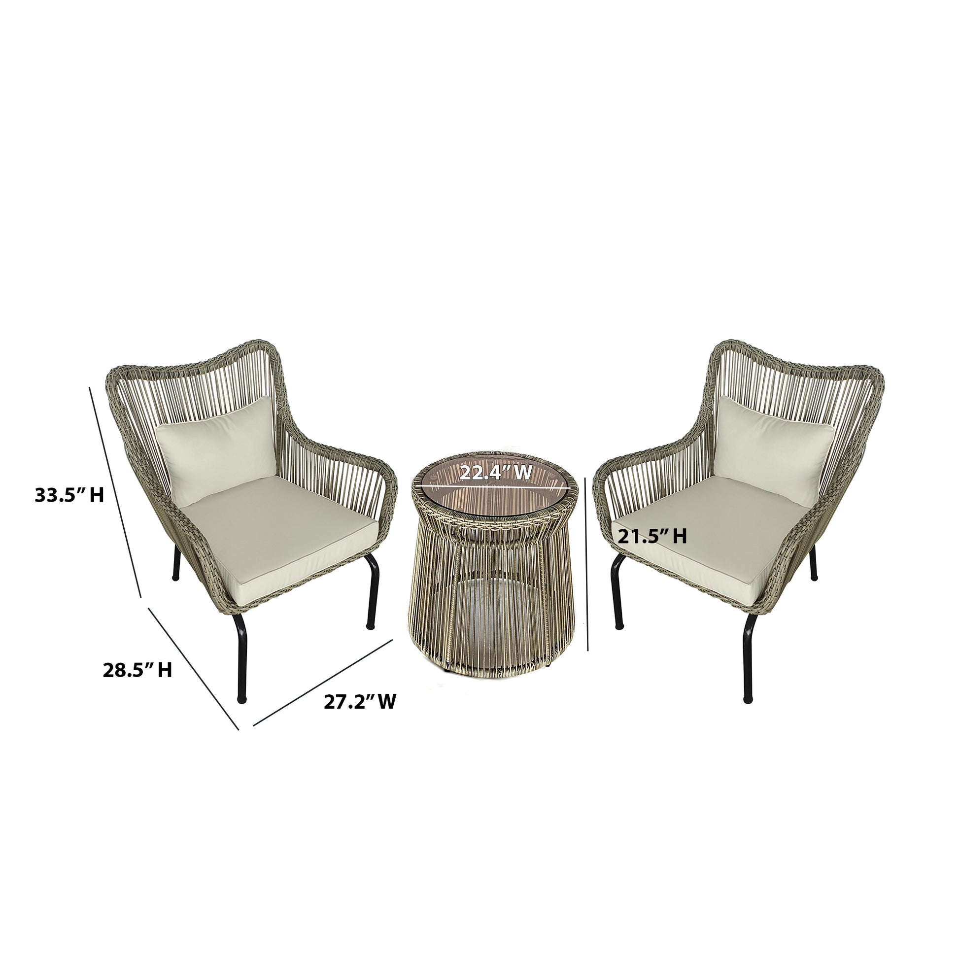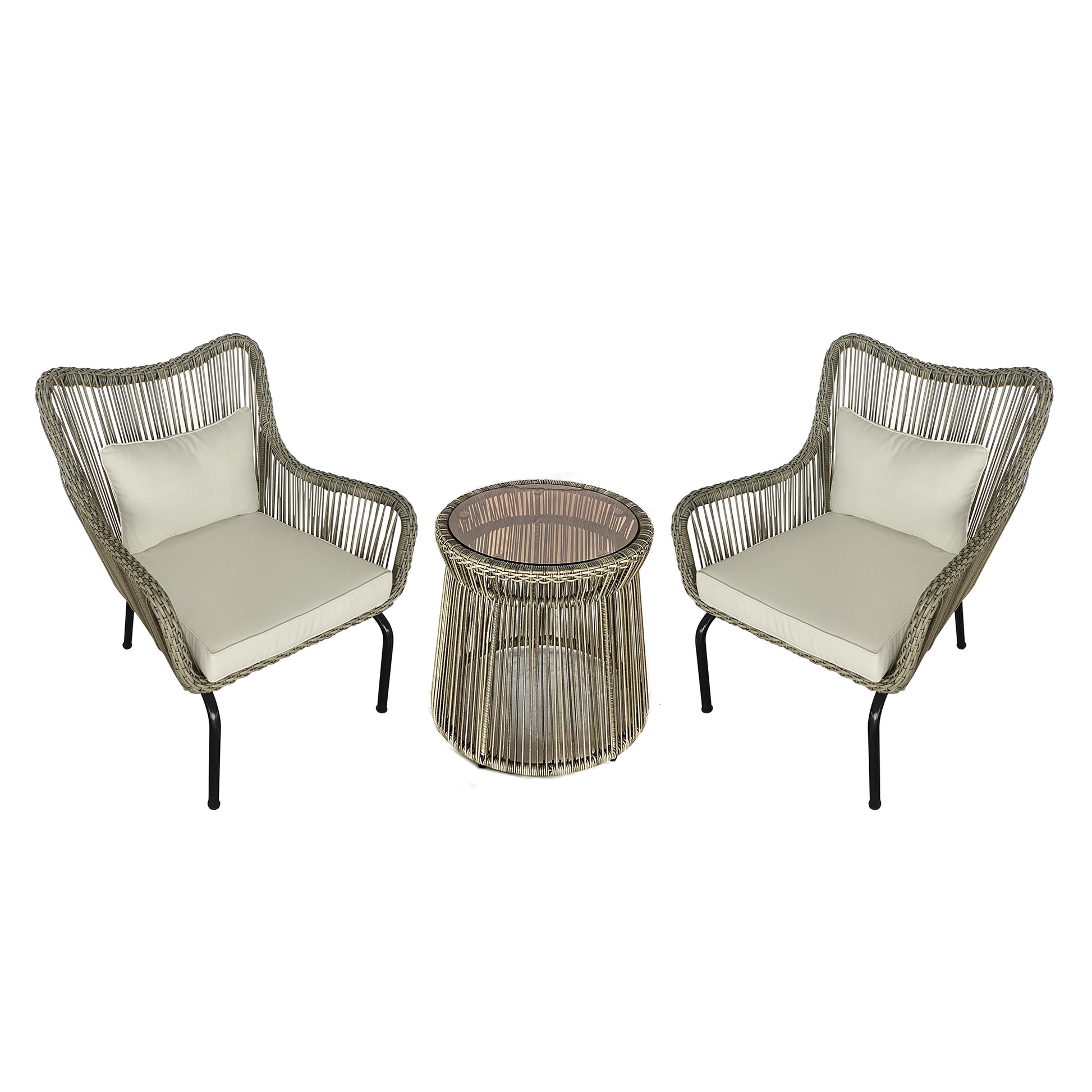 Does your patio or balcony need a touch of style and seating? This 3-piece conversation set with cushions makes it easy to add comfortable outdoor seating for two people to your outdoor living space. The armchairs feature cushions on the seats and backs, and the glass-top table provides a convenient, easy-to-clean surface for setting down your snacks and drinks. The set is made from wrapped rope wicker and powder-coated aluminum, so it holds up to outdoor conditions.