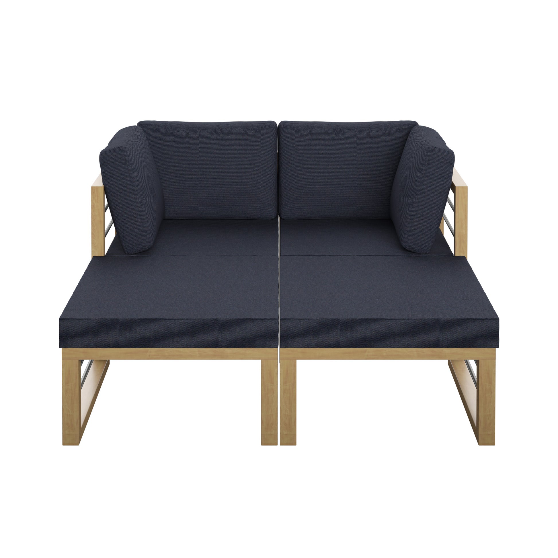 Whether you’re looking to relax or are entertaining on your deck or patio, you can do it in style with this TK Classics 4-Piece Outdoor Sectional Sunbed. With modern lines and a fresh look, this modular set includes a sectional loveseat (two corner sofa seats) and two ottoman/coffee tables. You can reconfigure the pieces of this set to suit your space, and thanks to the lightweight aluminum construction, moving the pieces is not a backbreaker. With weather-resistant aluminum that has a wood-grain coating, you get all the style and durability of wood furniture and none of the upkeep. Plus, the 2-in-1 design of the ottomans allow them to function as coffee tables when you need space for drinks and snacks. You’ll receive two cushion covers with this set. One cover is our standard color and is already on the cushions, and the other cover will be the color of your choice, so you can refresh your outdoor oasis whenever you’d like. Zippered, removable cushion covers are machine-washable (air dry only). Clips are included to keep the pieces from inching apart.