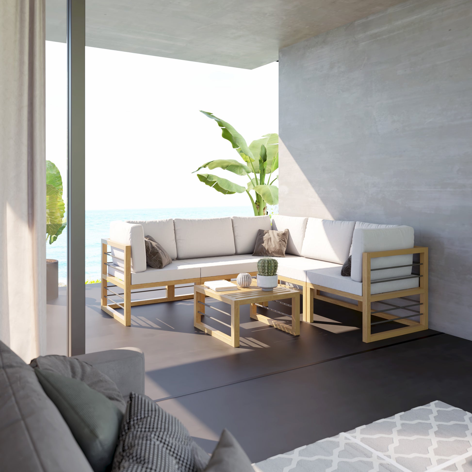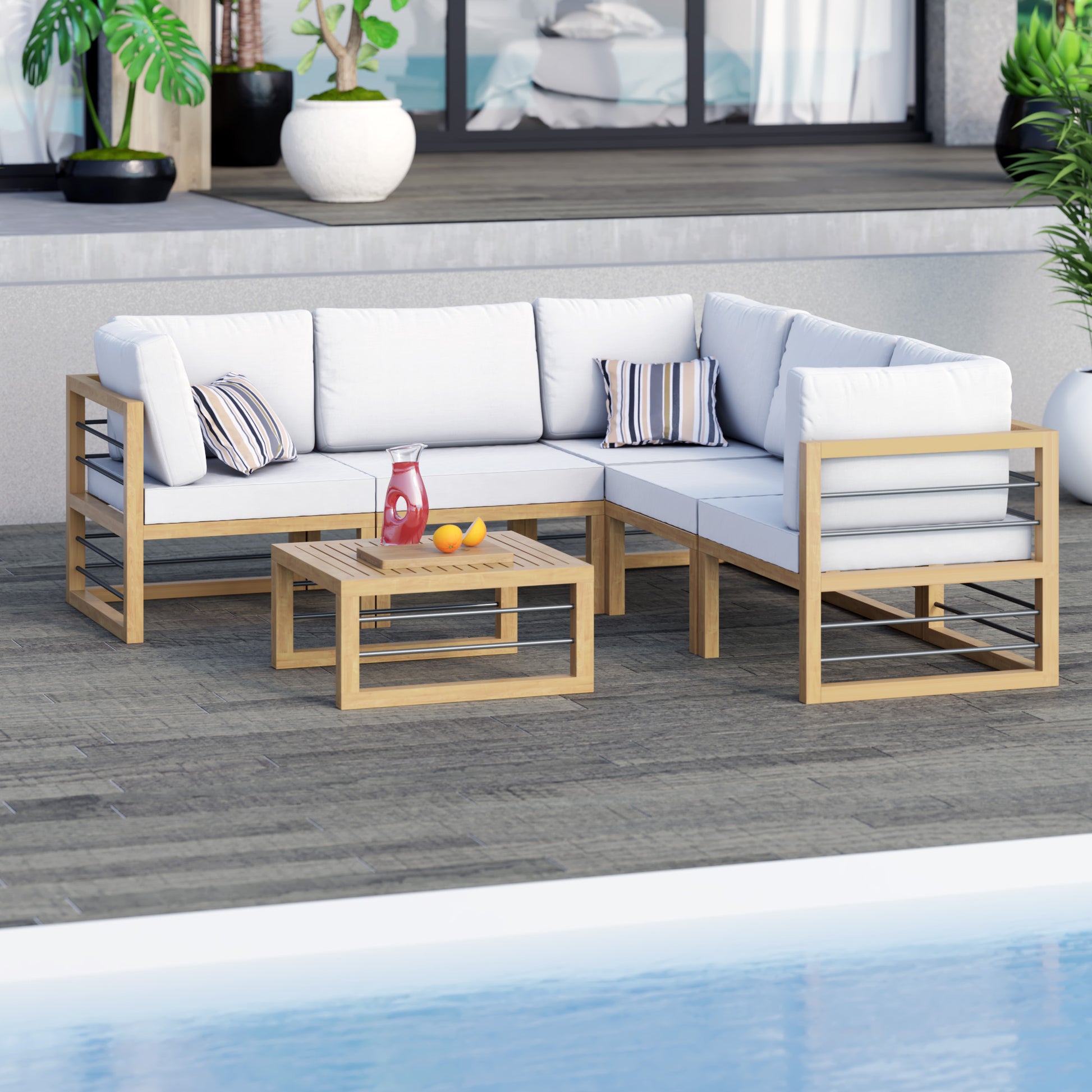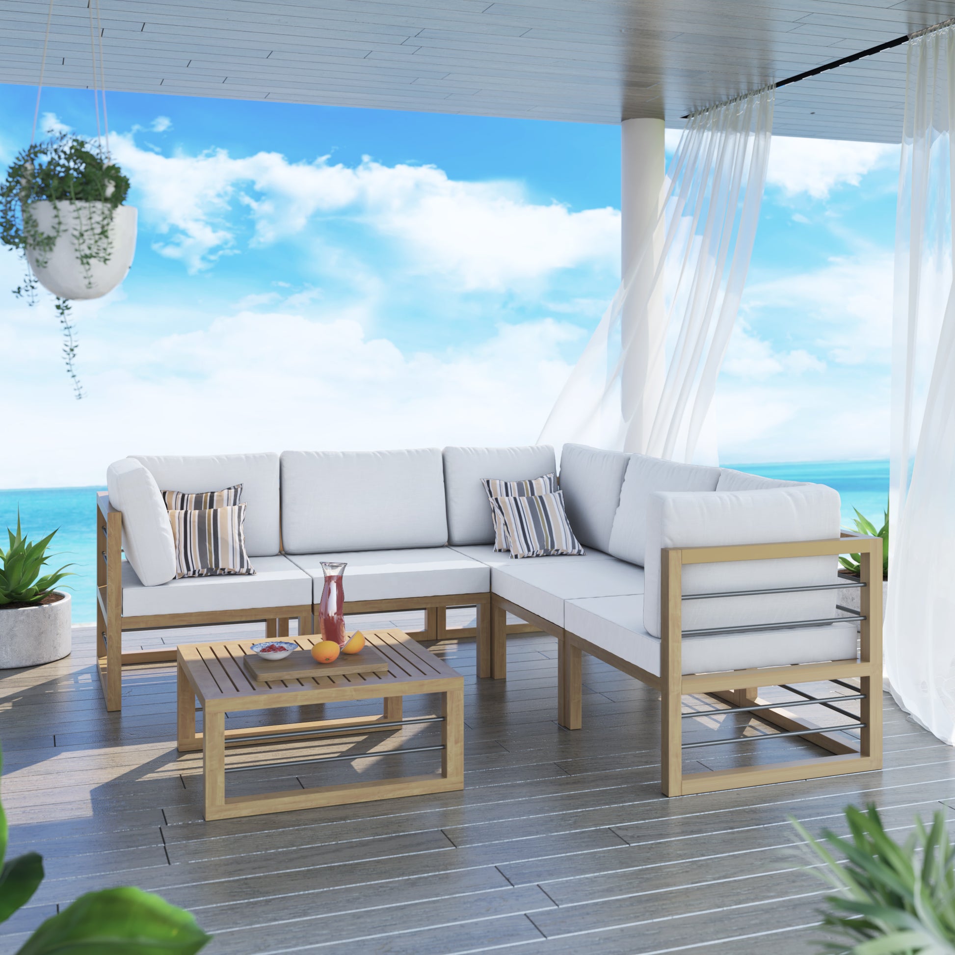 Whether you’re looking to relax or are entertaining on your deck or patio, you can do it in style with this 6 Piece Aluminum Outdoor Conversation Set. With modern lines and a fresh look, this modular set includes three corner sofa seats, two armless sofa seats, and one ottoman/coffee table. With weather-resistant aluminum that has a wood-grain coating, you get all the style and durability of wood furniture and none of the upkeep. Plus, the 2-in-1 design of the ottoman allows it to function as a coffee table when you need space for drinks and snacks. With these cushions, you’ll also receive two cushion covers. One cover is our standard color and is already on the cushion, and the other cover will be the color of your choice, so you can refresh your outdoor oasis whenever you’d like. Zippered, removable cushion covers are machine-washable (air dry only). Seats up to 5 people.