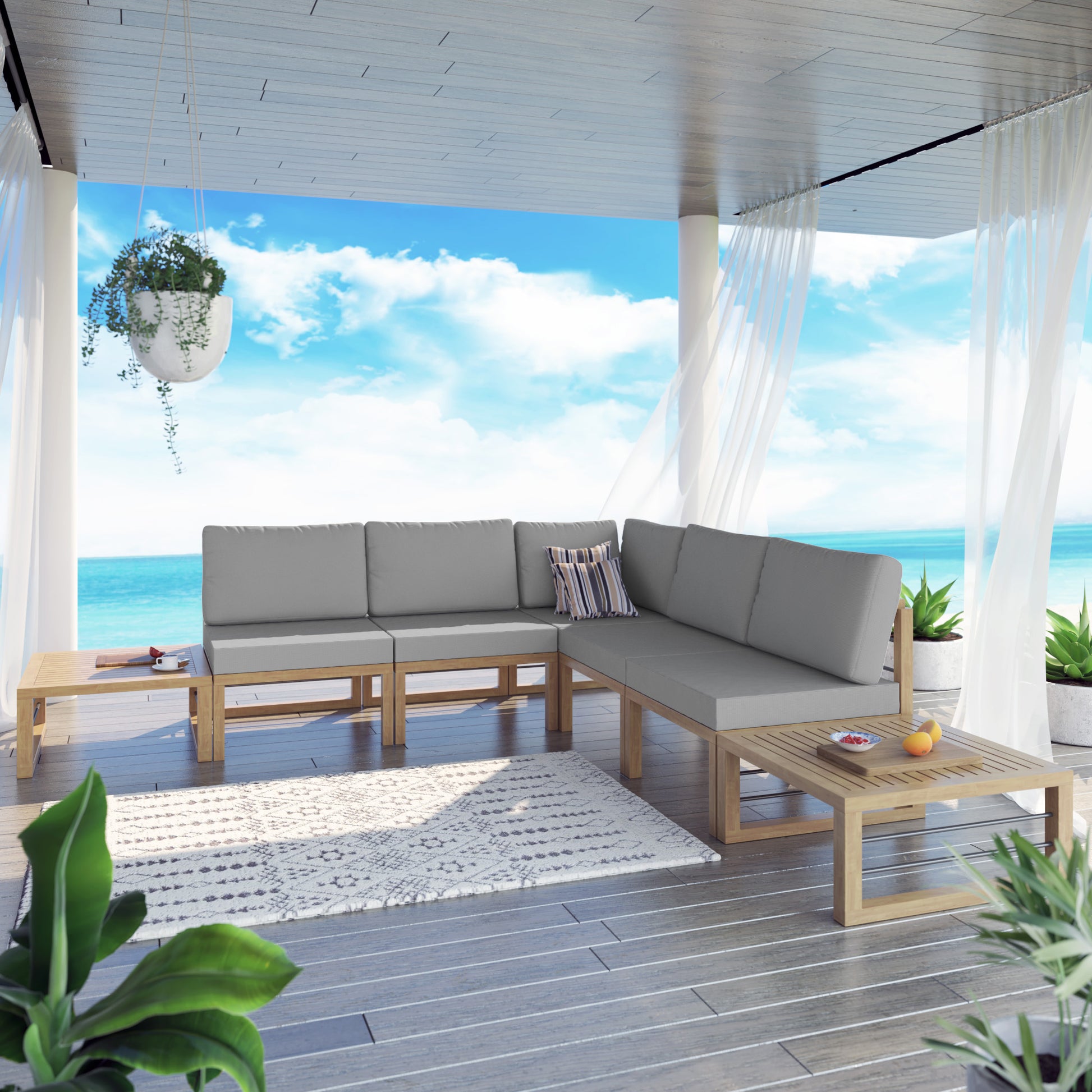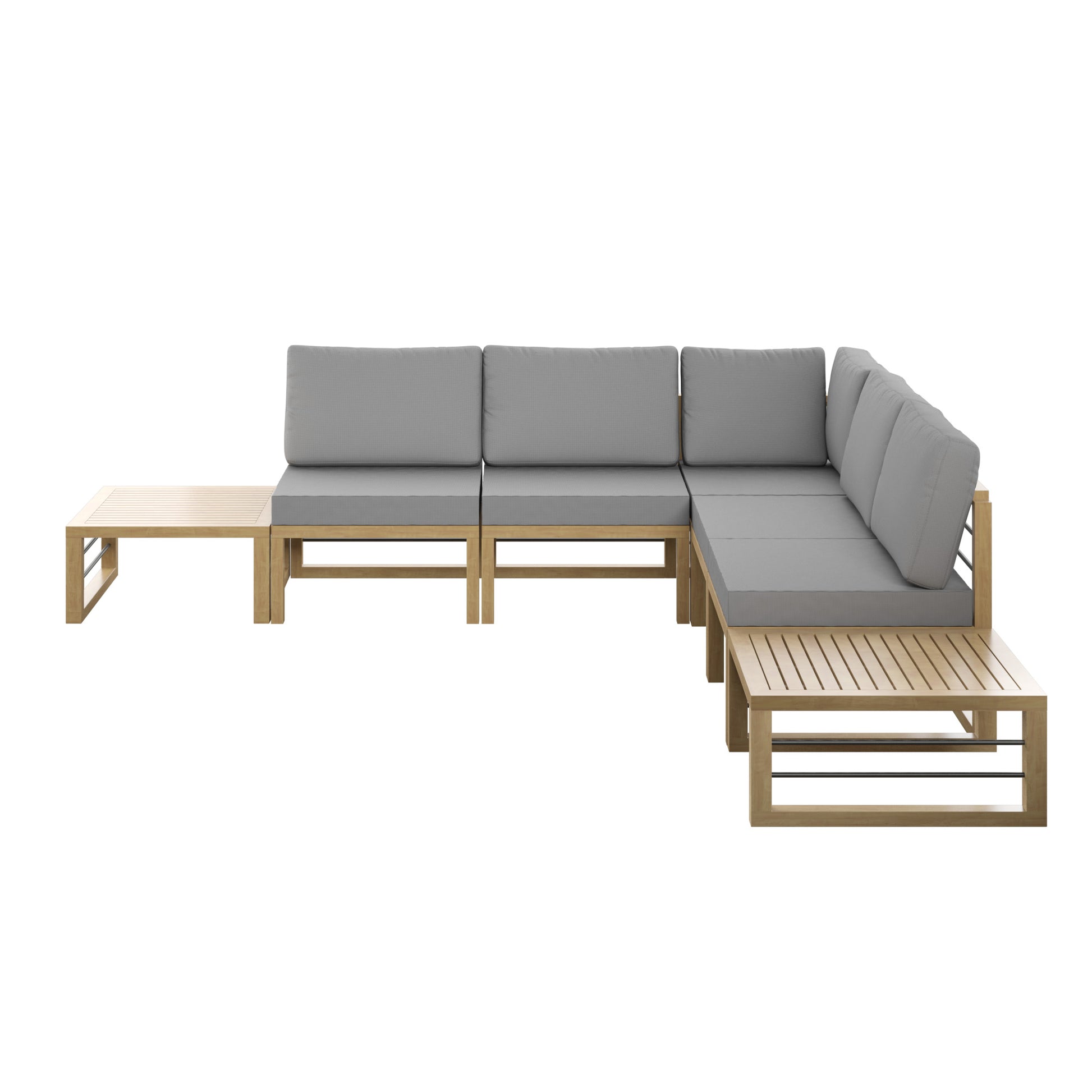 Whether you’re looking to relax or are entertaining on your deck or patio, you can do it in style with this 7 Piece Aluminum Outdoor Conversation Set. With modern lines and a fresh look, this modular set includes one corner sofa seat, four armless sofa seats, and two ottoman/coffee tables. You can configure the pieces of this set in a variety of ways to suit your space, and thanks to the weather-resistant aluminum that has a wood-grain coating, you get all the style and durability of wood furniture and none of the upkeep. With these cushions, you’ll also receive two cushion covers. One cover is our standard color and is already on the cushion, and the other cover will be the color of your choice, so you can refresh your outdoor oasis whenever you’d like. Zippered, removable cushion covers are machine-washable (air dry only). Plus, the 2-in-1 design of the ottomans allow them to function as coffee tables when you need additional space for drinks and snacks. Seats up to 5 people.