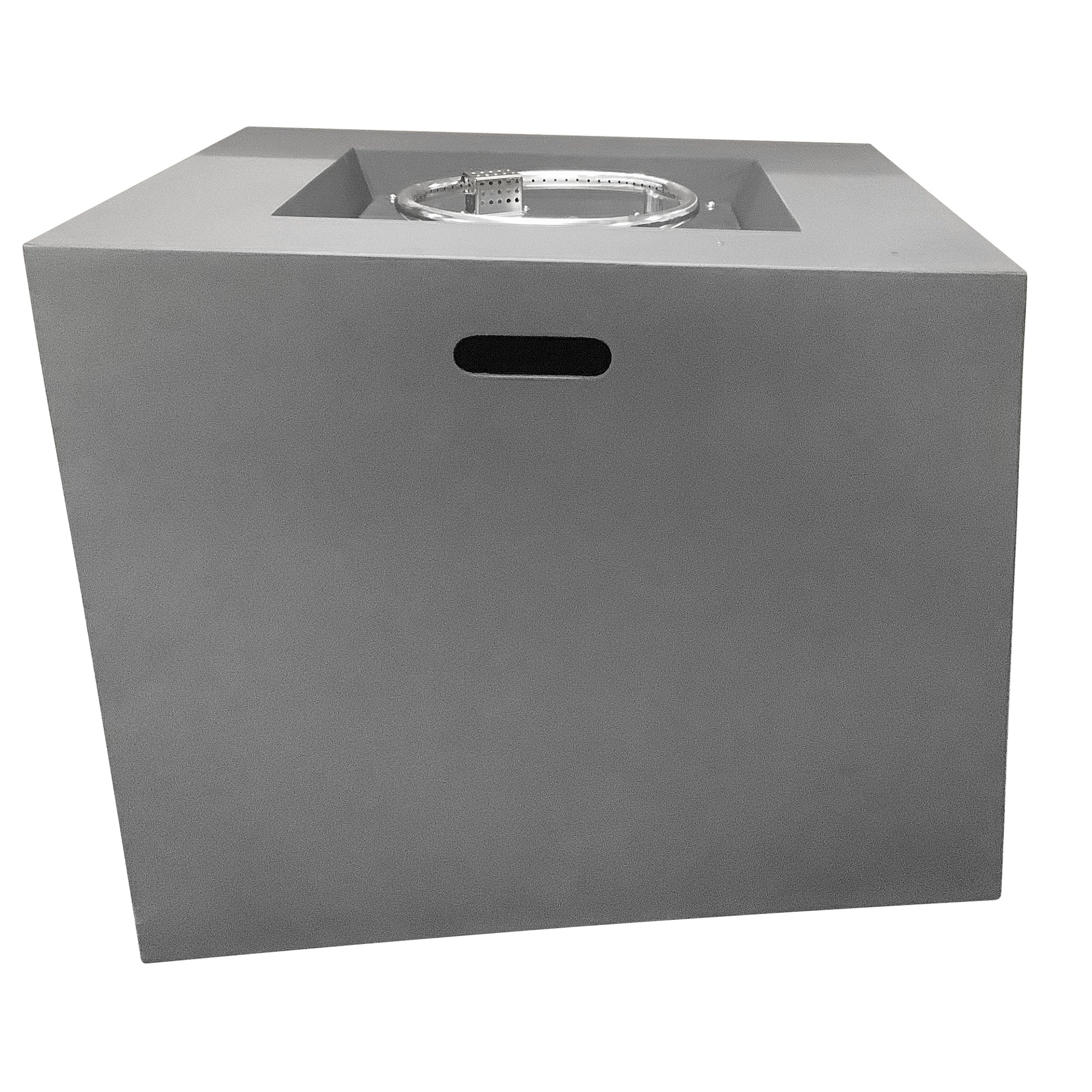 Crackling warmth on crisp evenings and a cozy gathering spot for family and friends – this asymmetrical square fire pit makes it all possible. The dark concrete finish and clean lines offer a fresh contemporary style. A 20 lb. propane tank (sold separately) fuels the fire and sits inside the base to maintain a sleek look. And when you’re all done for the evening, an added weather-resistant cover helps protect the fire pit from outdoor conditions.