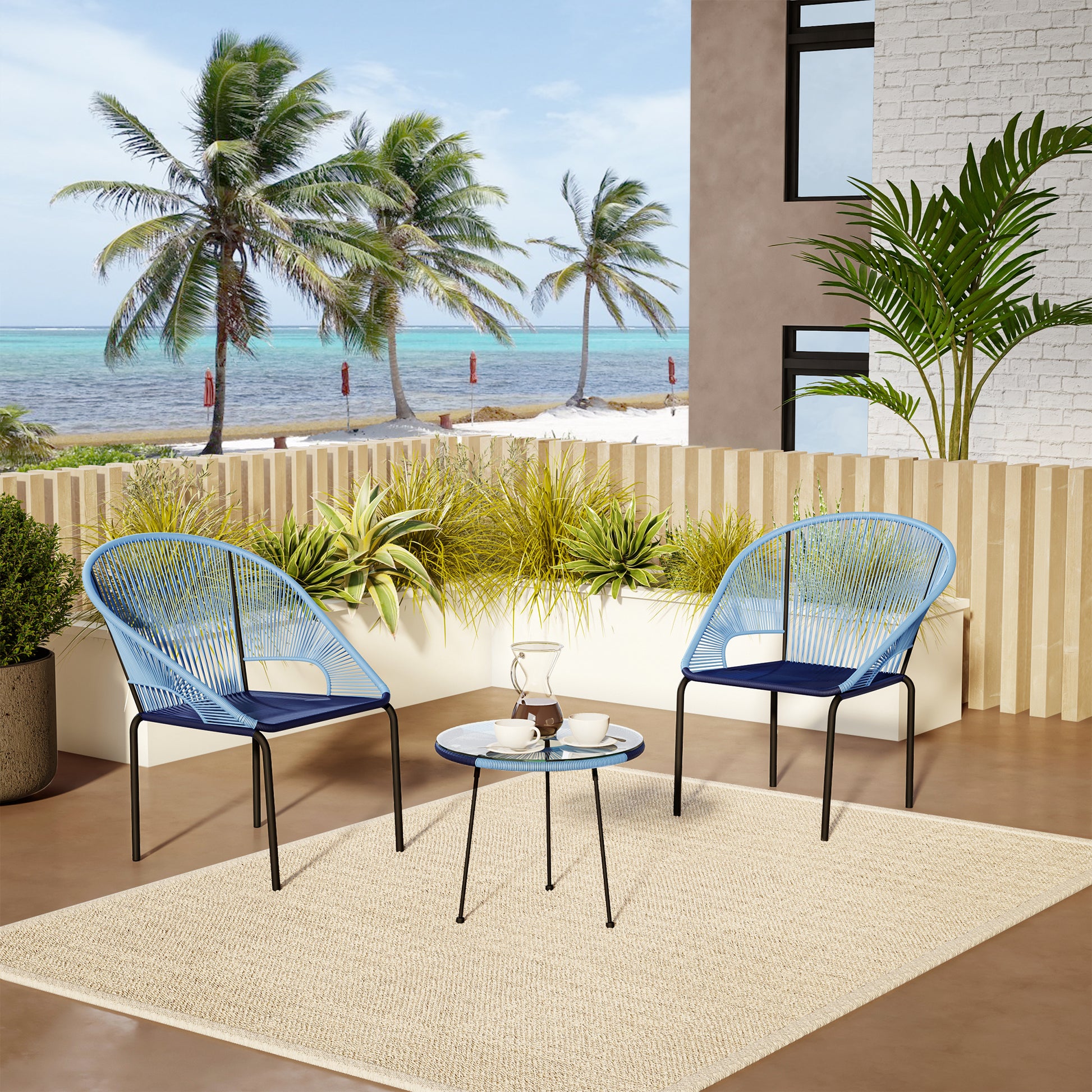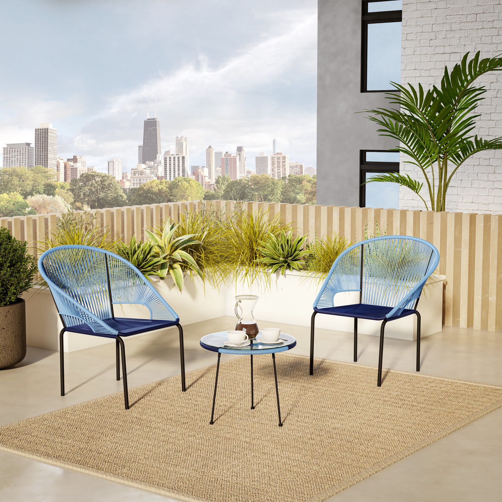 With two chairs and a side table, this 3-piece conversation set is everything you need to set up a cozy place on your balcony or patio for catching up with friends and loved ones. A wrapped rope design and powder-coated steel materials make this set weather-resistant and give it a modern look. The side table has a glass top which lets you conveniently set down drinks and snacks.