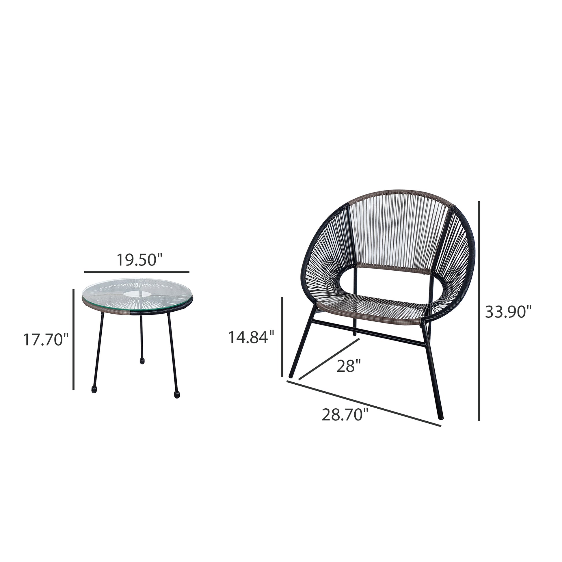 Create the style you’ve been picturing on your balcony, patio, or porch with this 3 Piece Conversation Set. Two chairs and a glass-topped table are the perfect spot to catch up with a friend. A wrapped rope wicker design and powder-coated steel frames make this modern set lightweight and weather-resistant with an unforgettable look. And this set is as easy to clean as it is to love - just wipe down with soap and water.