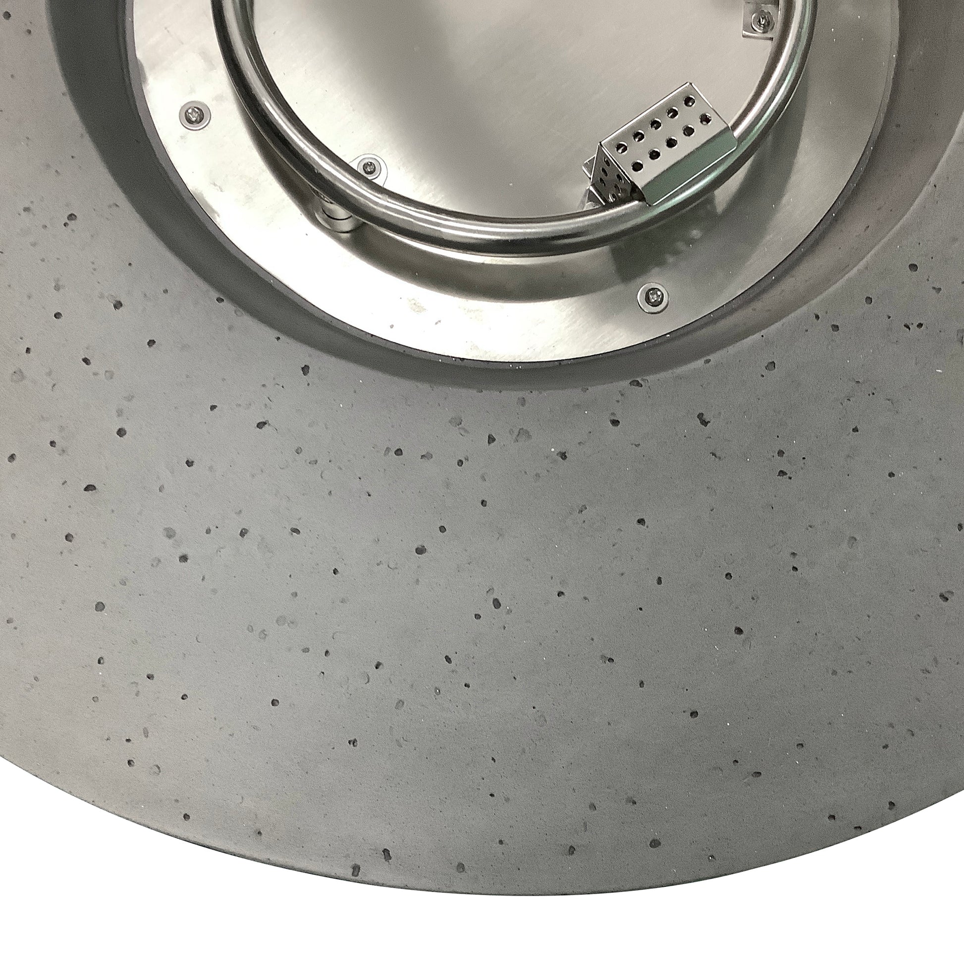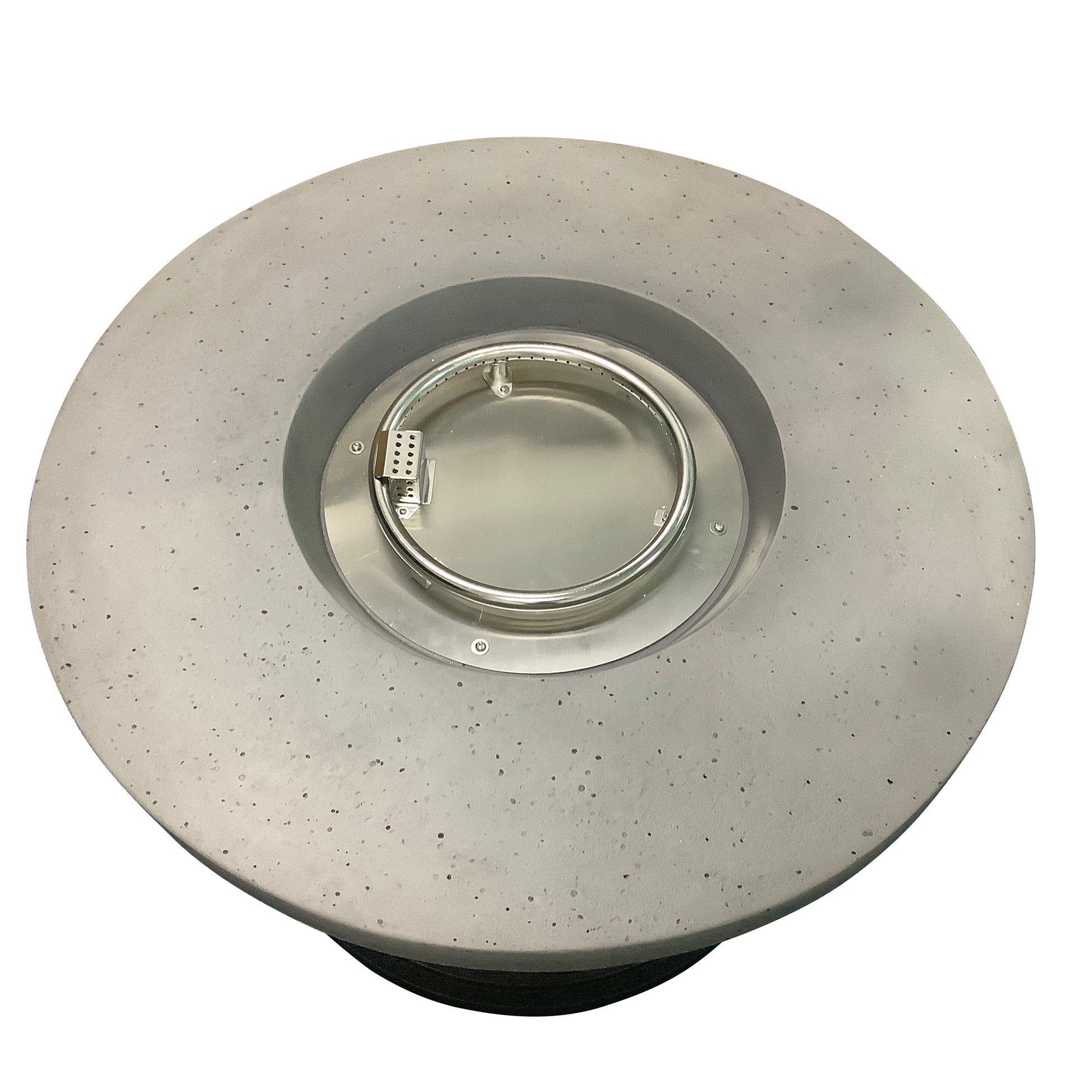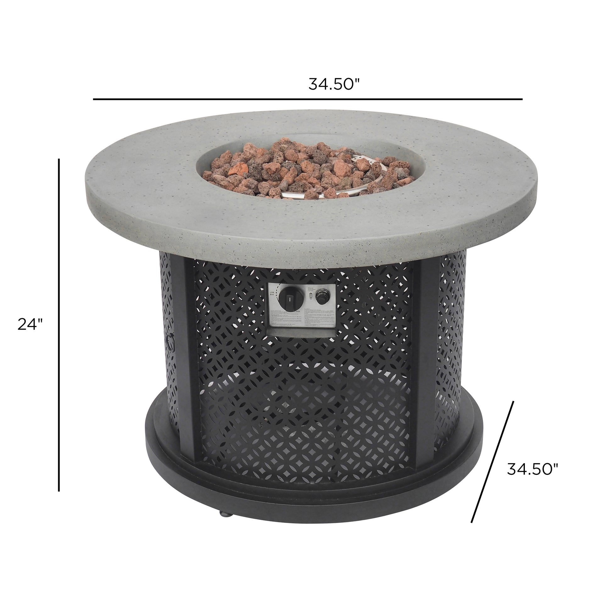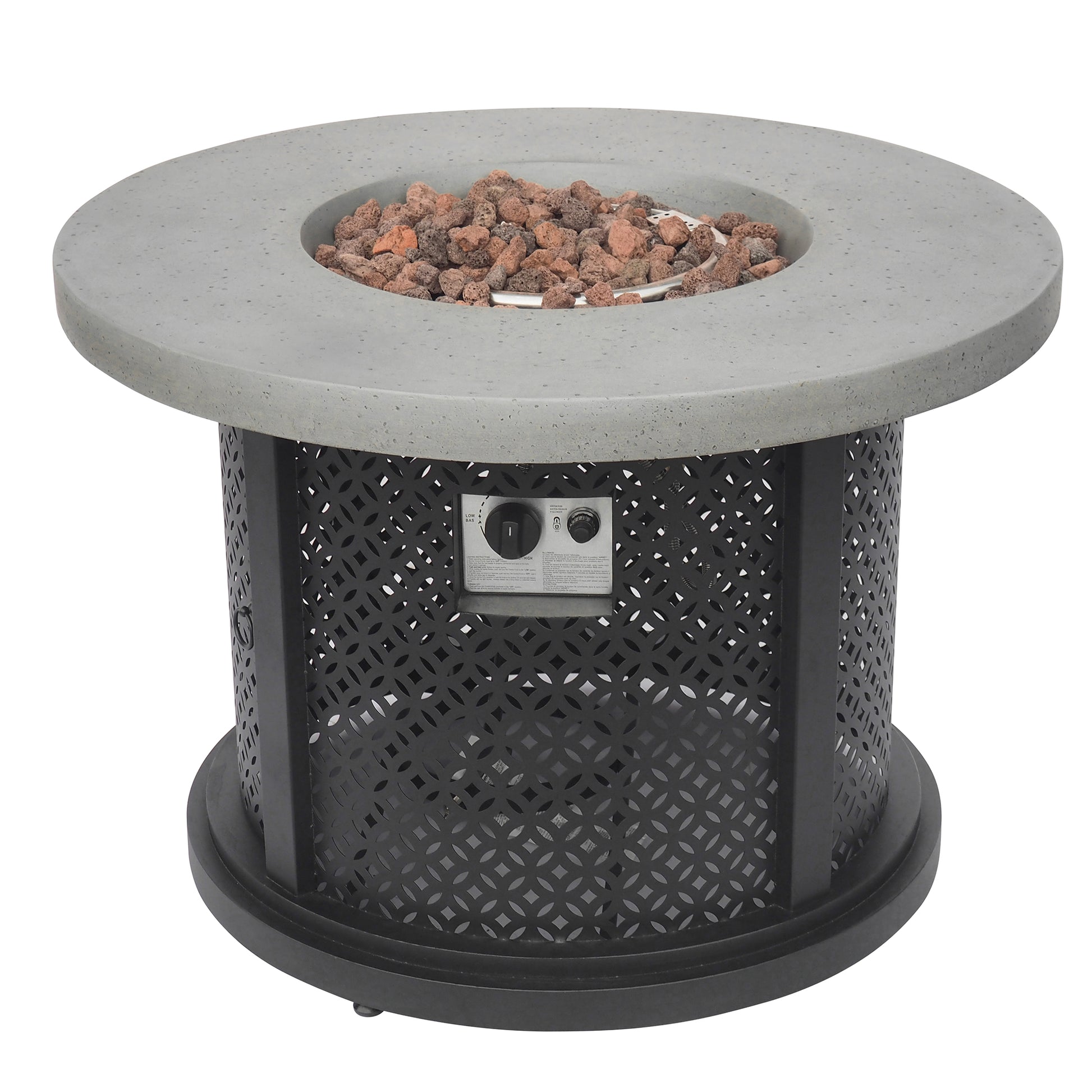 Create a cozy atmosphere with family and friends with this round fire pit table. A shadow black metal base offers a stylish contrast to the classic concrete top. The setup includes lava rocks and space for a 20 lb. propane tank (sold separately), which conveniently hides the tank for a sleek look. An included weather-resistant fabric cover protects the fire pit table from outdoor conditions when it’s not in use.
