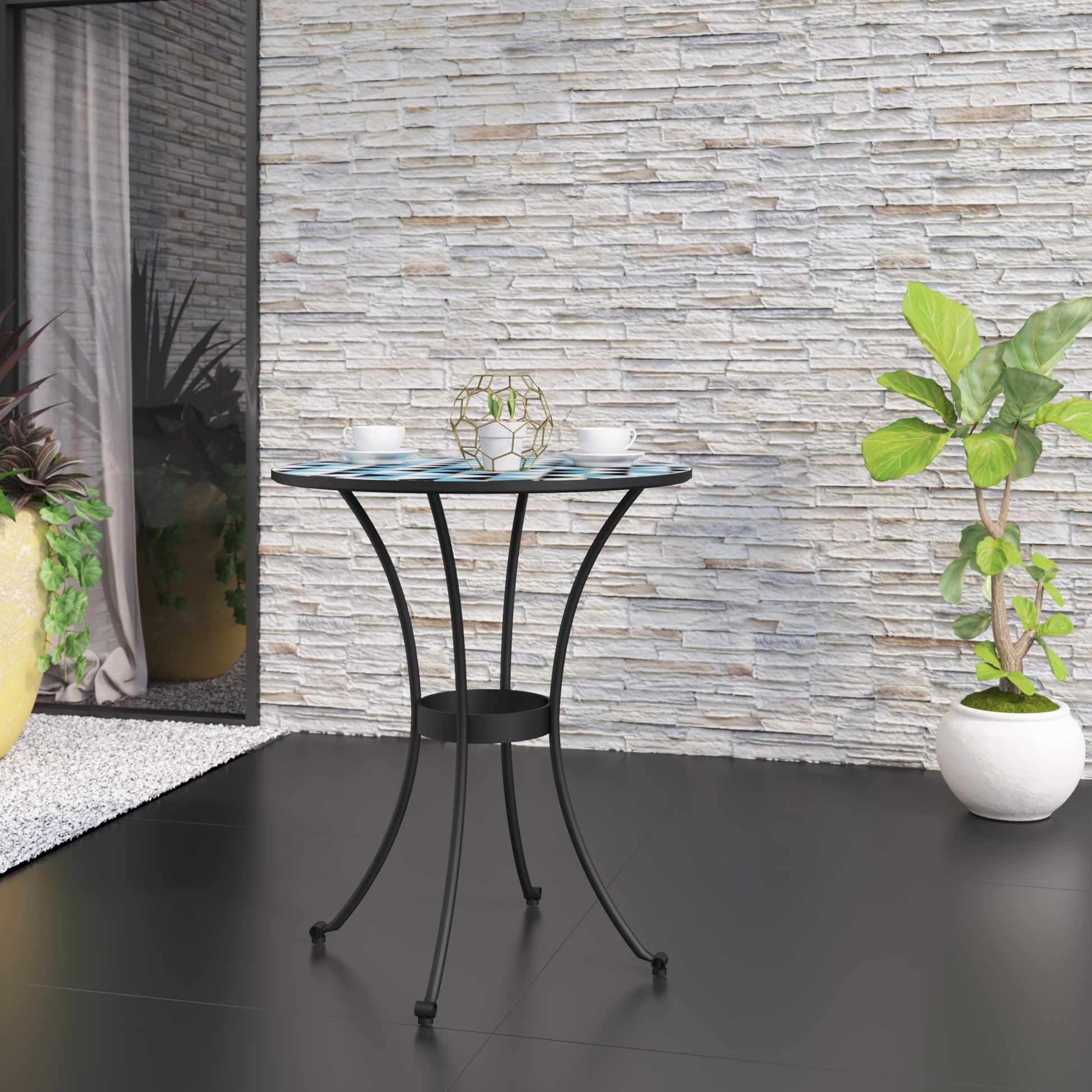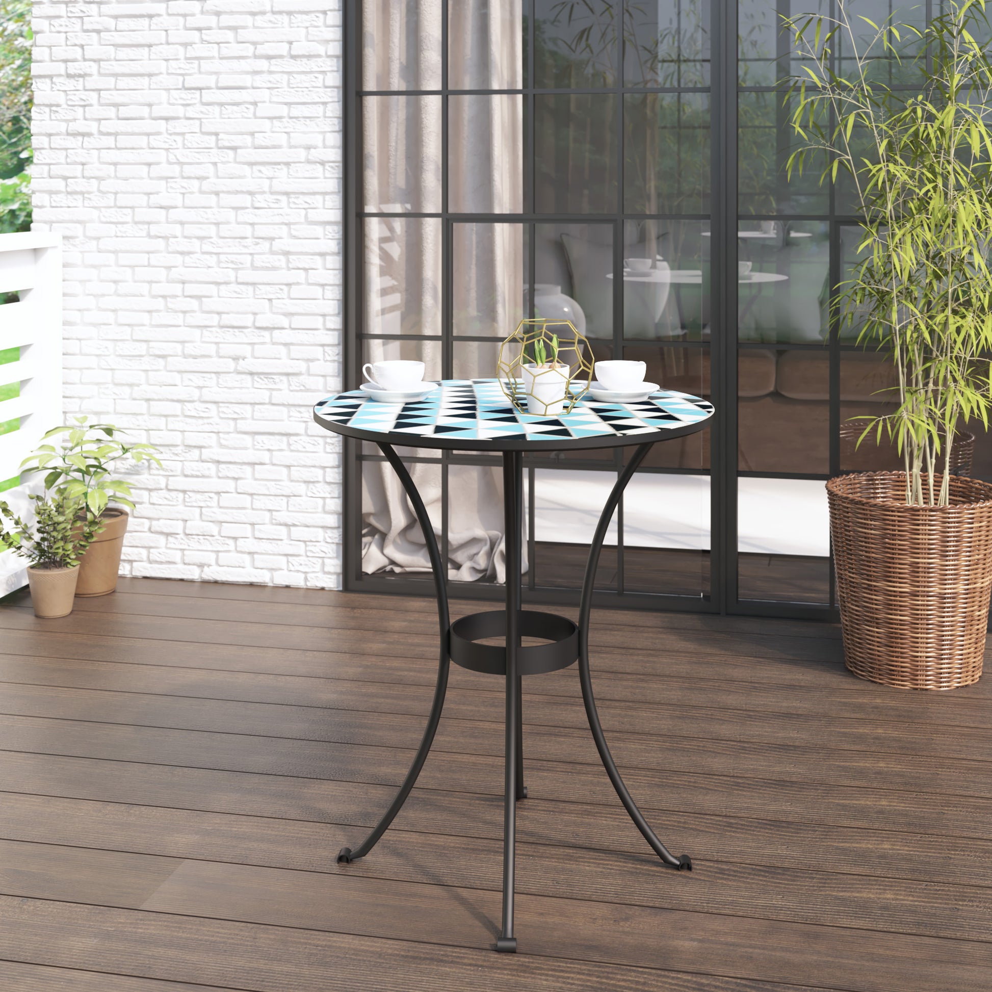Add a cool, contemporary look to your outdoor oasis with this stylish outdoor dining table. The triangular mosaic pattern adds a cool contemporary style to your outdoor space. Plus, the powder-coated steel construction offers durability for a long-lasting outdoor oasis, creating a relaxing area for years to come. Set up this outdoor dining table on your deck, patio, or balcony and enjoy your space, whether you’re catching up with a friend over drinks or basking in the morning sun with a fresh cup of coffee.