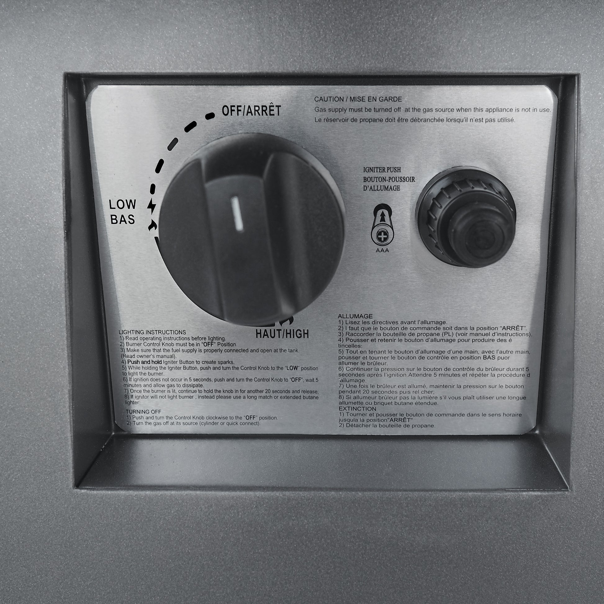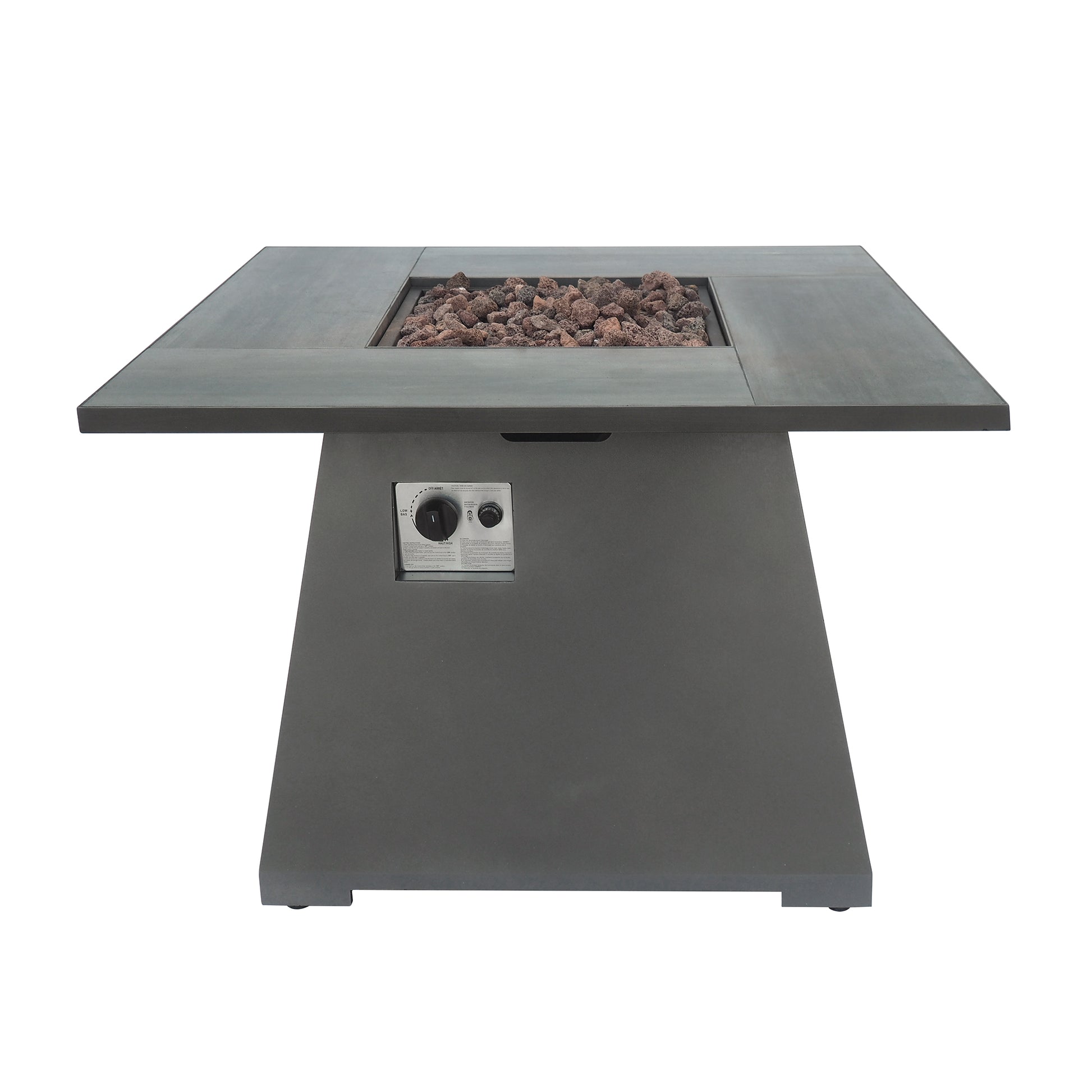 Create a cozy atmosphere with family and friends with this stylish, durable fire pit table. The metal base is large enough to conceal a 20 lb. propane tank (sold separately) while the ceramic slate tile top and lava rocks add charm to your outdoor living space. A fitted square panel extends your table space by covering the lava rocks when fire pit not in use. Simple push-button ignition and adjustable flames make this fire pit table easy to use, plus it comes with its own weather-resistant cover when you want to protect it from the elements.