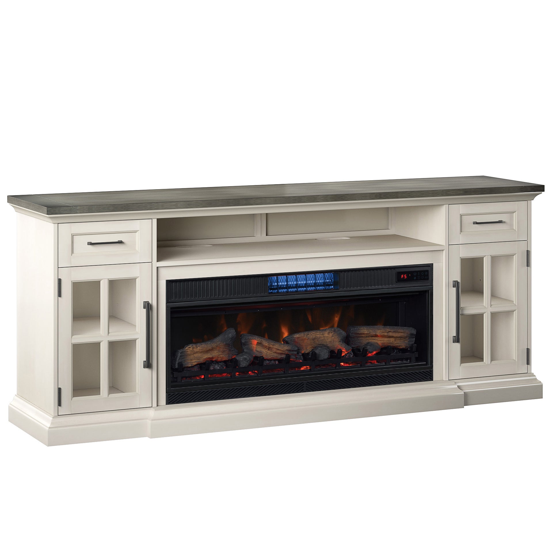 Upgrade your living room with stylish design and the innovation of a ClassicFlame® CoolGlow™ 2-in-1 electric fireplace and fan. CoolGlow™ delivers year-round temperature control, for the warmth of an infrared quartz electric fireplace and cool breeze of an oscillating fan when you need them most. And because safety is paramount to you, you'll enjoy the peace of mind that you'll get from Safer Plug® fire prevention technology, which monitors the temperature of the plug to prevent electrical fire, circuit or product damage. There's no shortage of either storage or stylish quality with this TV stand that holds most flat screen TVs up to 80 inches and 90 pounds. A large, open center AV shelf holds cable boxes and gaming consoles while each side cabinet contains two adjustable shelves each. _x000D_