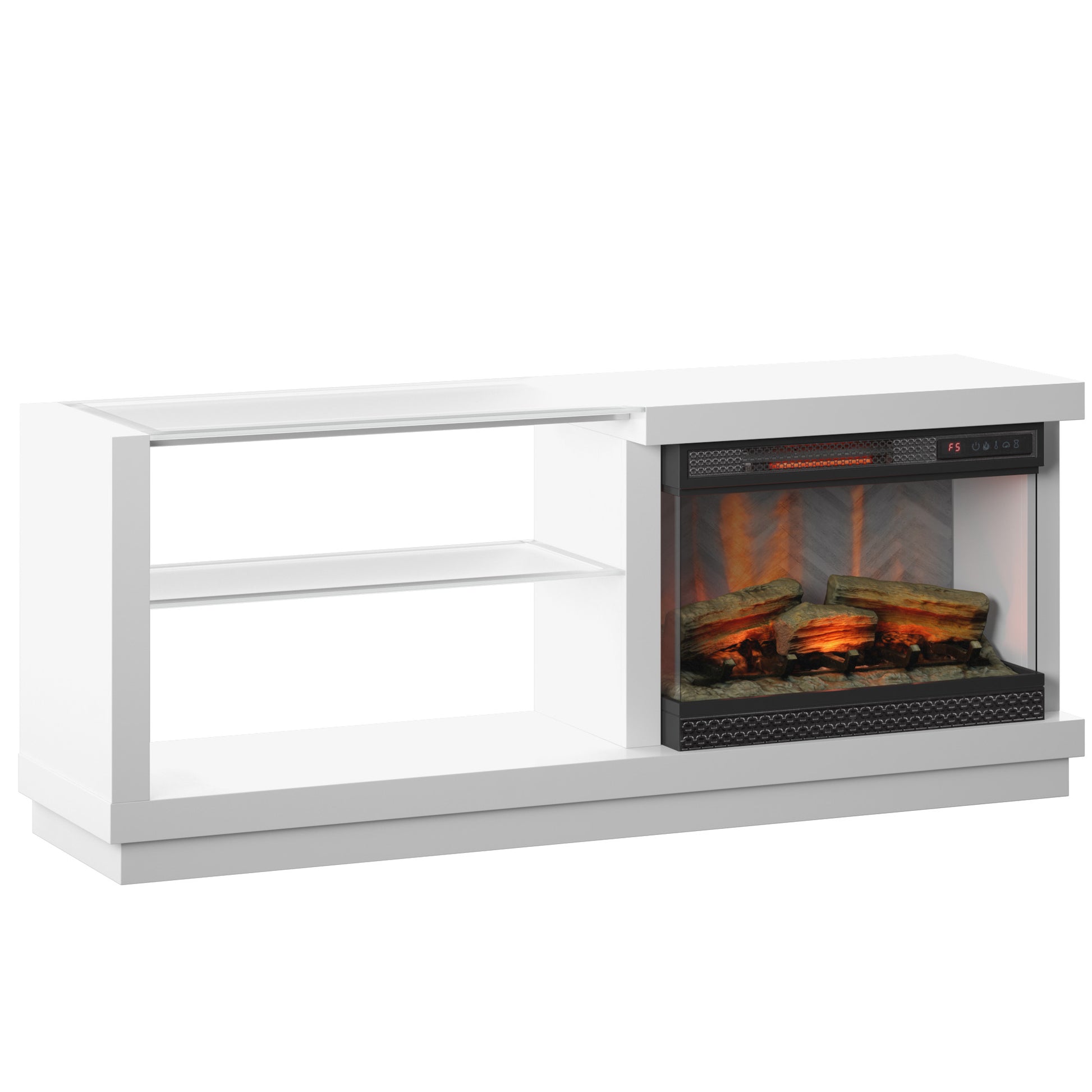 This TV stand with electric fireplace will hold your TV of up to 65 inches and 60 pounds with chic, modern style. Open architecture glass shelves show off living room treasures perfectly while also giving easy remote control access to a cable box, stereo equipment, or other AV components. Meanwhile, the electric fireplace has a three-sided glass display that lets you and guests enjoy a view of beautiful flames from any seat in the room. Set the mood for any occasion throughout the year with independent flame and heat controls that let you turn on the patent pending 3D Flame® effect while the heat is off. During colder months, efficient infrared quartz heating supplies up to 1,000 square feet of heat to your home without drying out the air, for the most comfortable warmth possible.